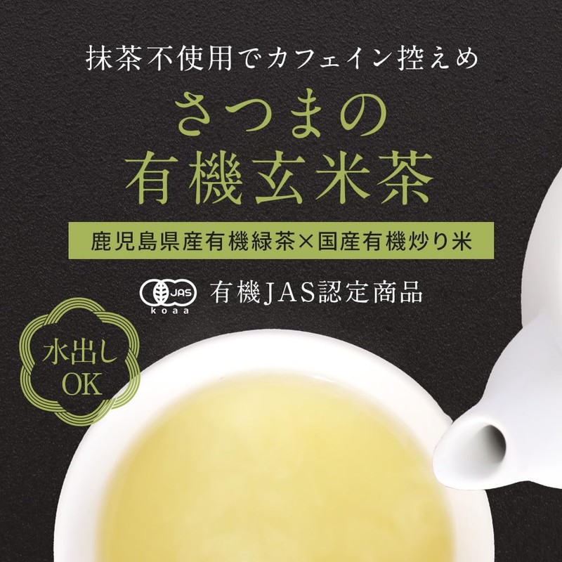 - 【抹茶不使用カフェイン控えめ】鹿児島県産有機緑茶と、国産有機炒り米を使用した、有機JAS認定商品「さつまの有機玄米茶」です。水出しOK。深みのある香ばしさとすっきりとした味わいです。茶葉を使用していないため、一般的な玄米茶と比べてカフェインが控えめです。おやすみ前にもお飲みいただけます。
