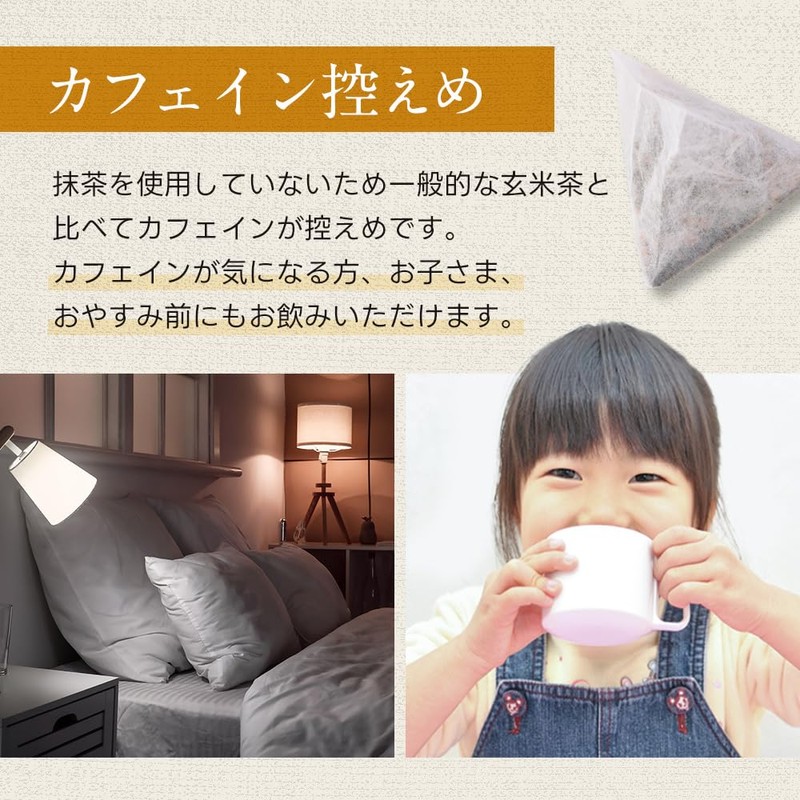 - 【有機茶葉・有機炒り米使用】お茶の有機栽培が盛んな鹿児島。暖かい土地で太陽の光を浴びながら育った茶葉は、調和のとれた濃厚な味わいが特徴です。玄米茶ならではの香ばしさの秘密や、炒り米に含まれる香り成分「ピラジン」。玄米茶の風味を左右する炒り米には、こだわりの国産米を使用し、風味豊かに仕上げました。