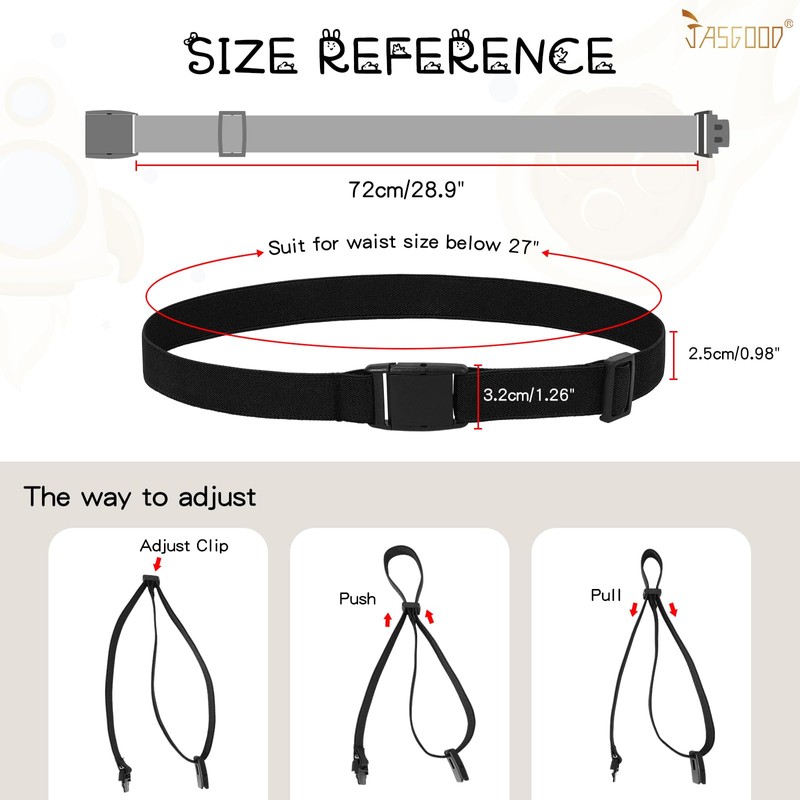 - Size Info---This kids adjustable belt suits for waist size below 27”. Belt strap width :0.9”, buckle width 1.26”. The kids belt size is adjustable and elastic. One size fits all, just adjust the size to fit your kid waist.