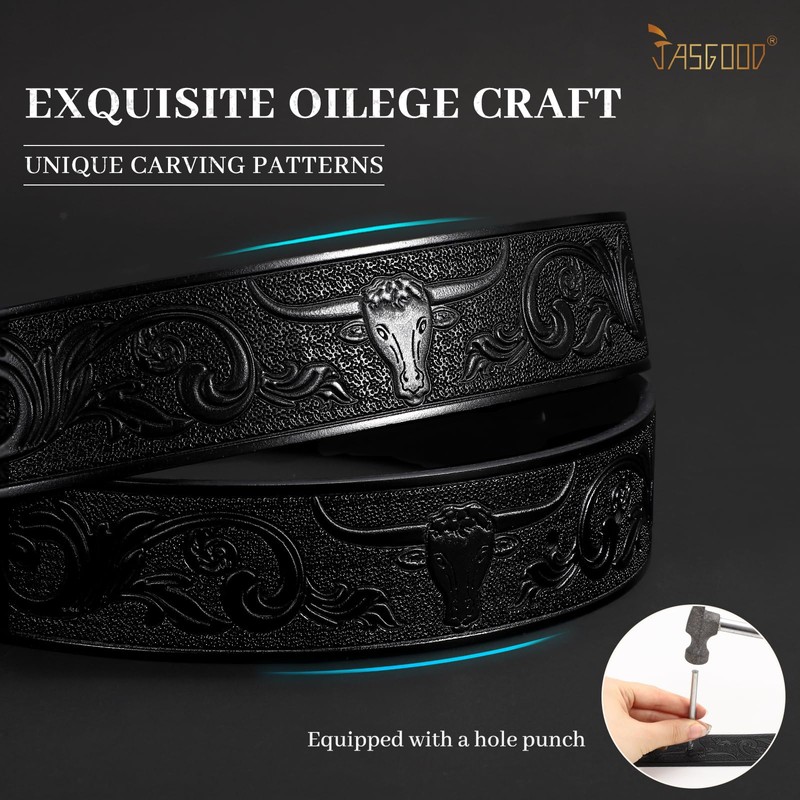 JASGOOD Western Leather Belt Strap for Men Engraved Cowboy Belt Strap without Buckle 1.5'' Wide Long Horn Bull Western Belt