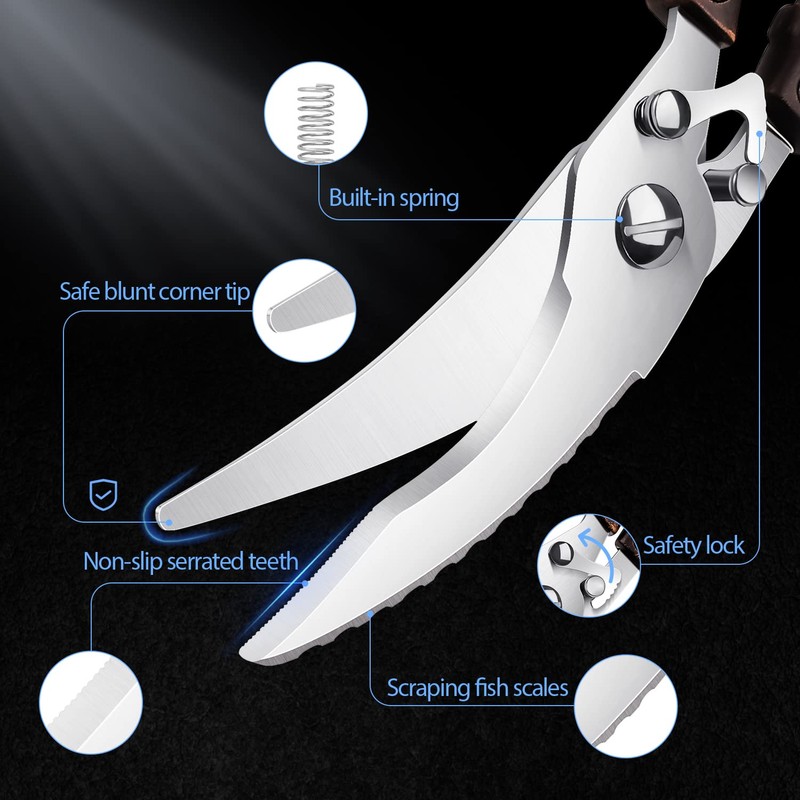 - Ergonomic and comfortable handles - The ergonomically designed handles of the kitchen scissors are made of high-quality brass, which makes them comfortable and non-slip. In addition, the handles of the kitchen scissors are suitable for both right and left handed users. The ergonomic fish mouth handle ensures a comfortable grip when cutting ingredients. Eight reinforced rivets are deeply recessed into the handles for a strong and stable grip.