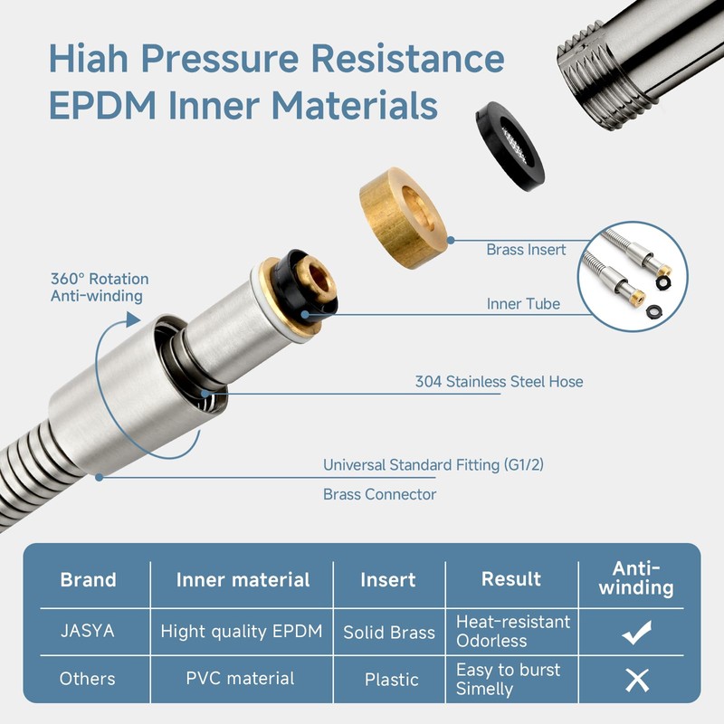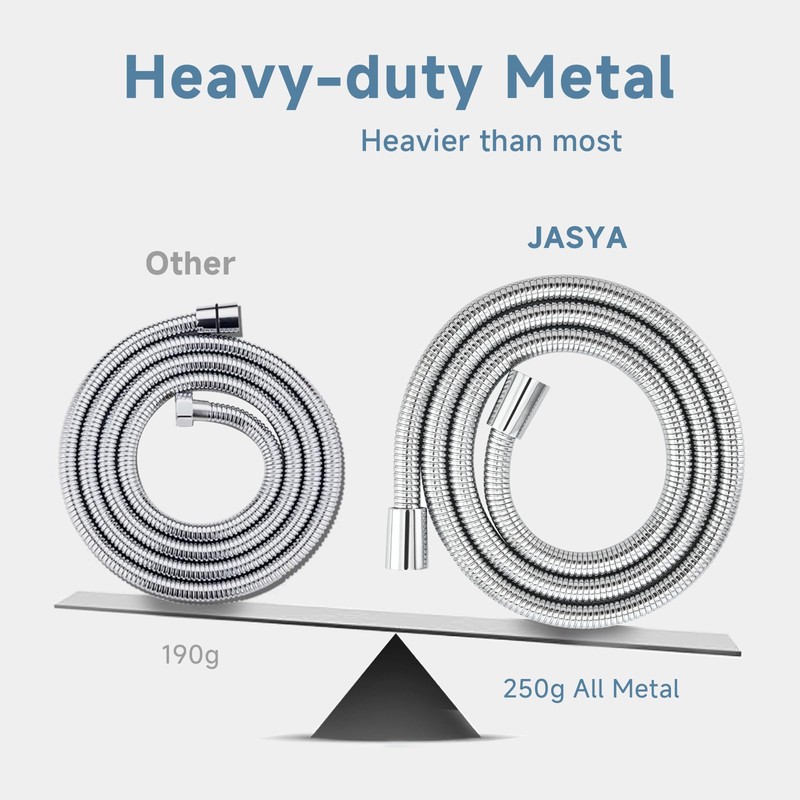 - Advanced shower hose:JASYA shower head hose is made of high-quality 304 stainless steel outer tube, PVC inner tube, and high-quality brass precision processed, which has the characteristics of high temperature resistance, explosion-proof, sealing, leak prevention, high flexibility, and durability.