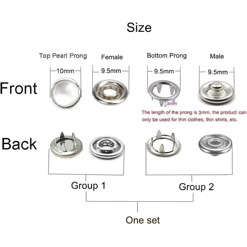 - The prong snap button have a pearl-like finish and durable, metal exterior.