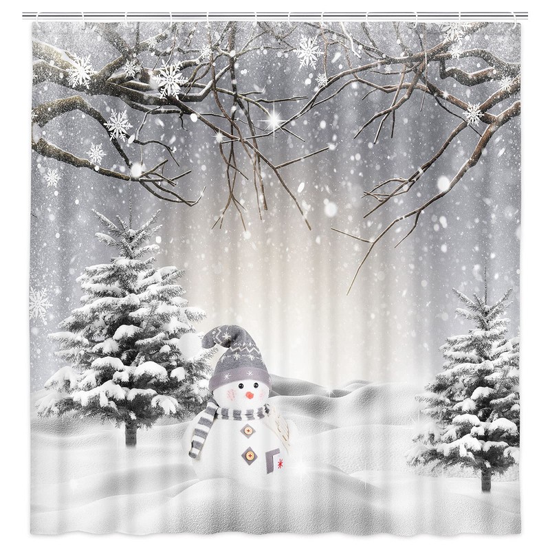 JAWO Winter Christmas Shower Curtain, Cute Snowman Snowflake Scene Shower Curtains for Bathroom, Pine Tree Covered Snow Fabric Bath Curtains Set with Hooks, 69x70 Inches