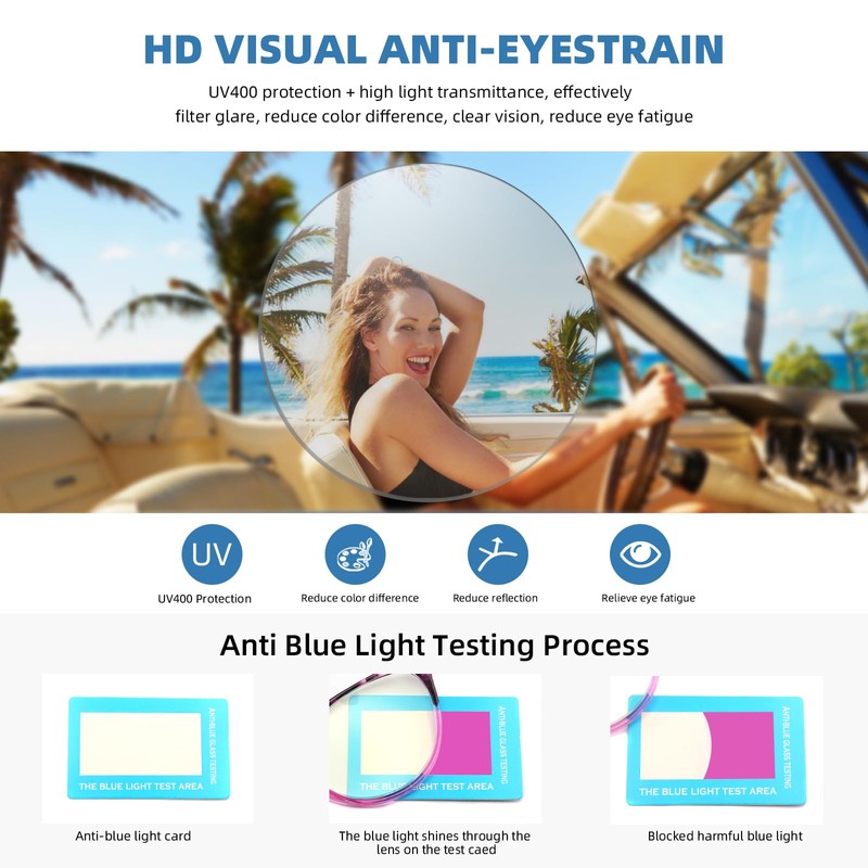 - [Anti Blue Light Glasses]Our anti-blue light lens adopts double protection technology, not only coating the surface of the lens with anti-blue light layer, but also adding blue light factor into the basic material of the lens, which can block harmful blue light more effectively for a long time.