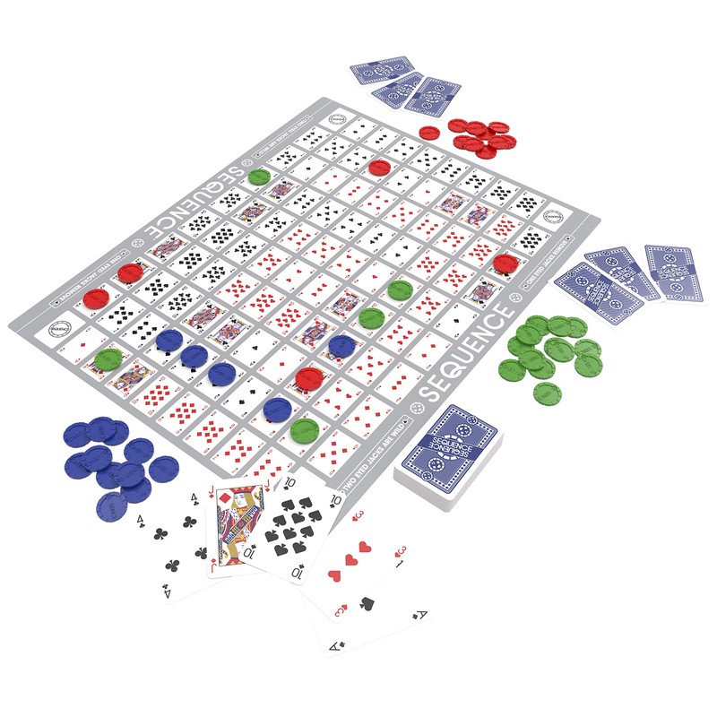 It's the fun and challenging game of SEQUENCE in a designed game tin! Play a card from your hand, place a chip on a corresponding space on the game board…when you have five in a row, it’s a SEQUENCE. Learn to block your opponents or remove their chips, and watch out for the Jacks - they're wild! With a little strategy and luck, you'll be a winner! Tin easily stores the folding game board and pieces, which include playing cards, 135 playing chips and complete instructions. For 2-12 players, ages 7 and up.