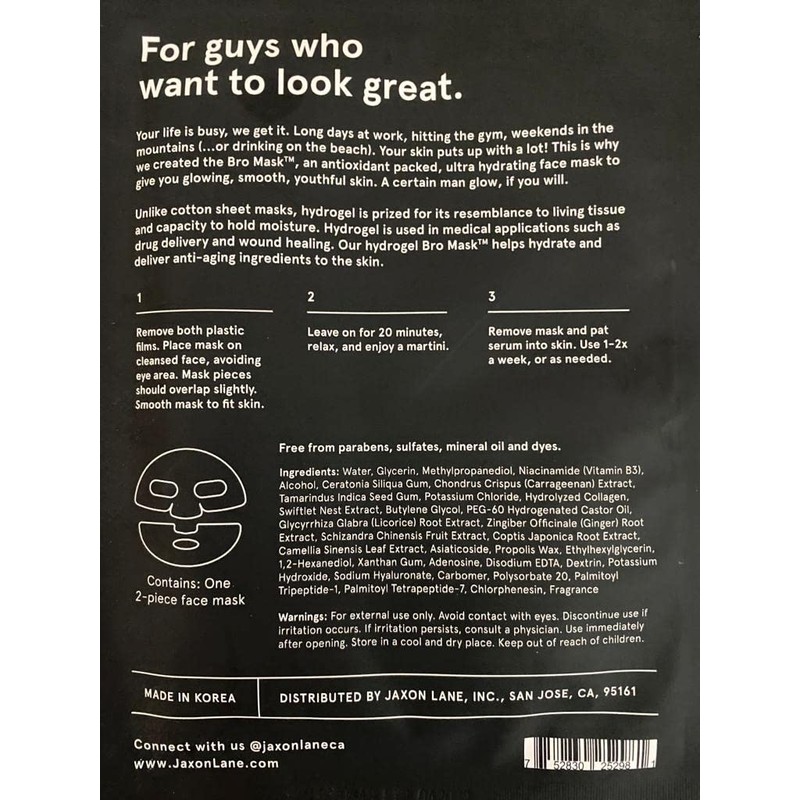 JAXON LANE BRO MASK Korean Face Mask for Men: Premium Mens Face Mask Skin Care & Facial Anti Aging Sheet Masks with Hydrogel, Vitamin C & E, Hydrating Hyaluronic Acid & Hydrolyzed Collagen (4 Pack)