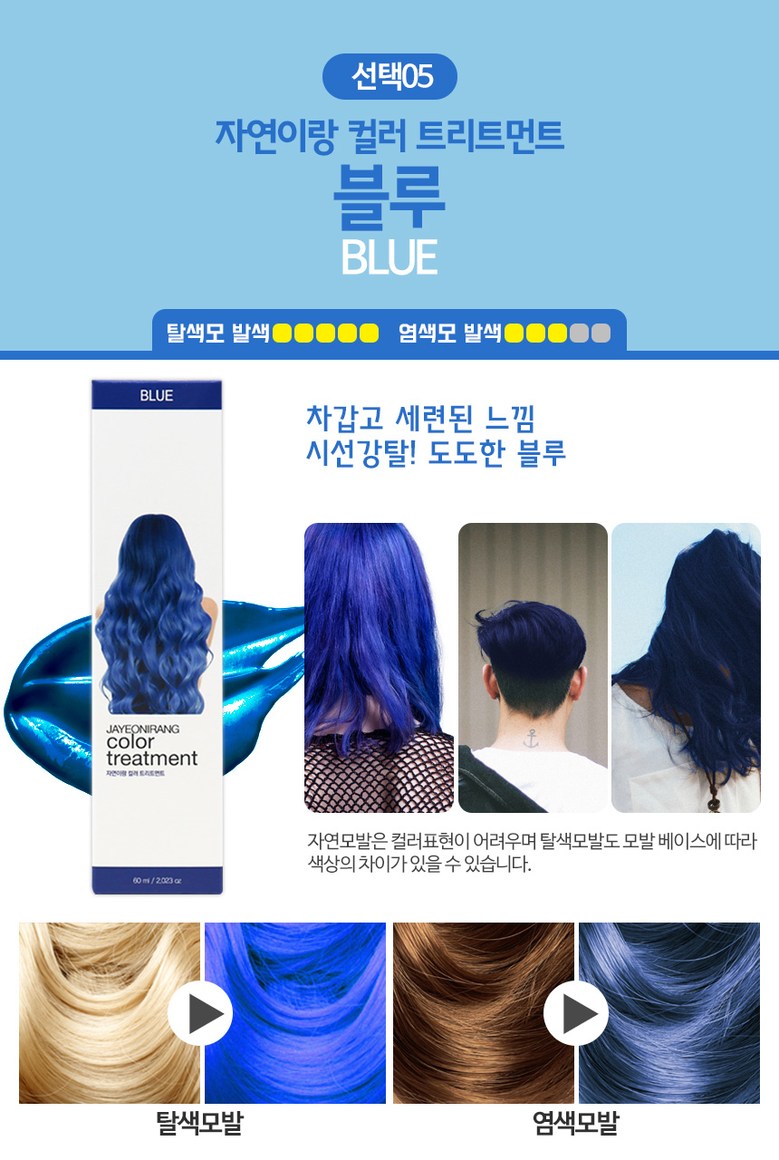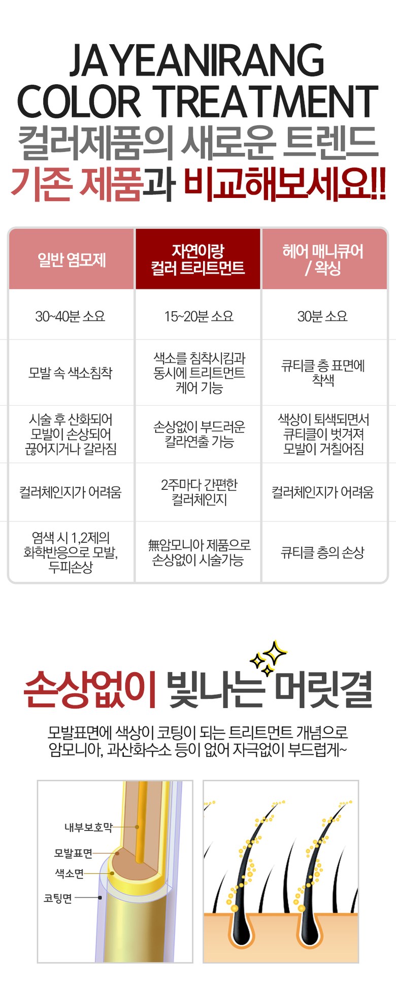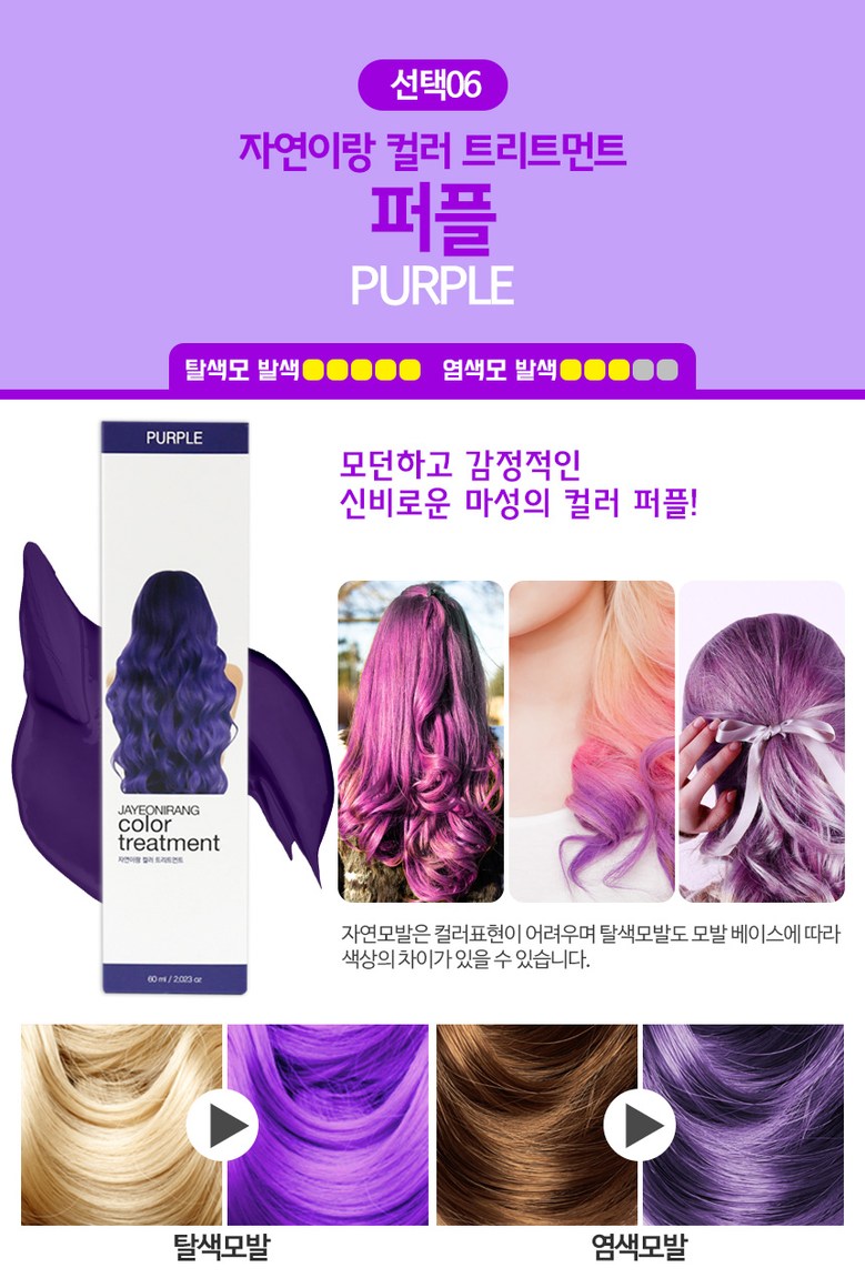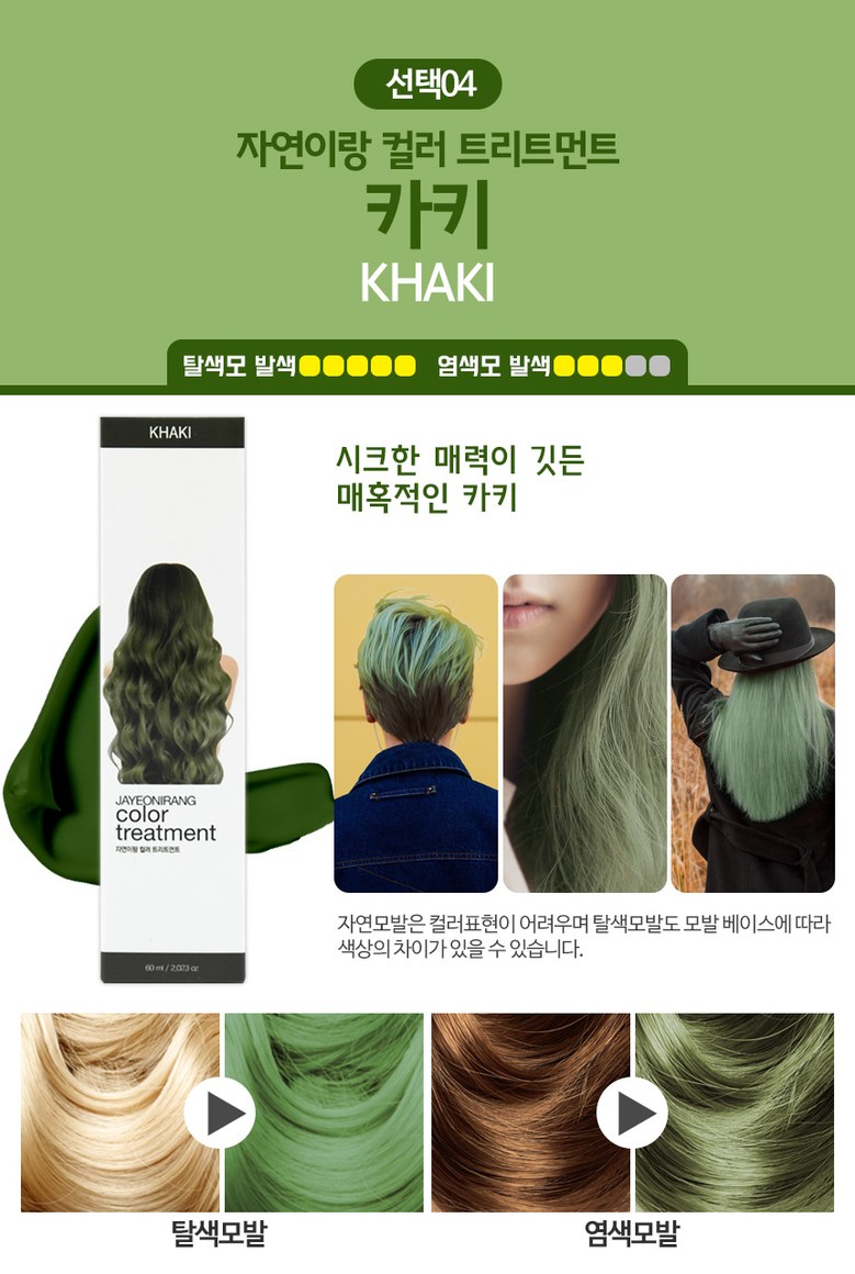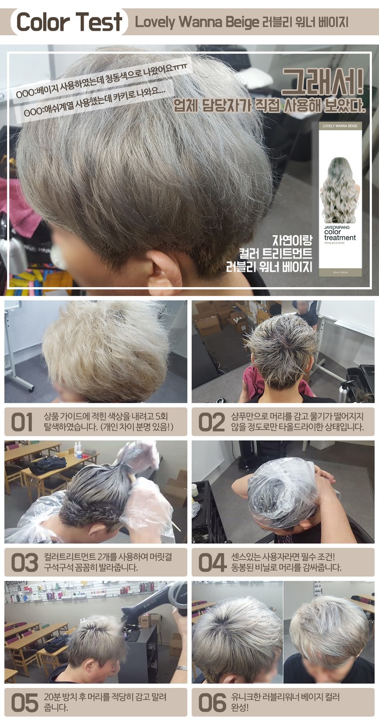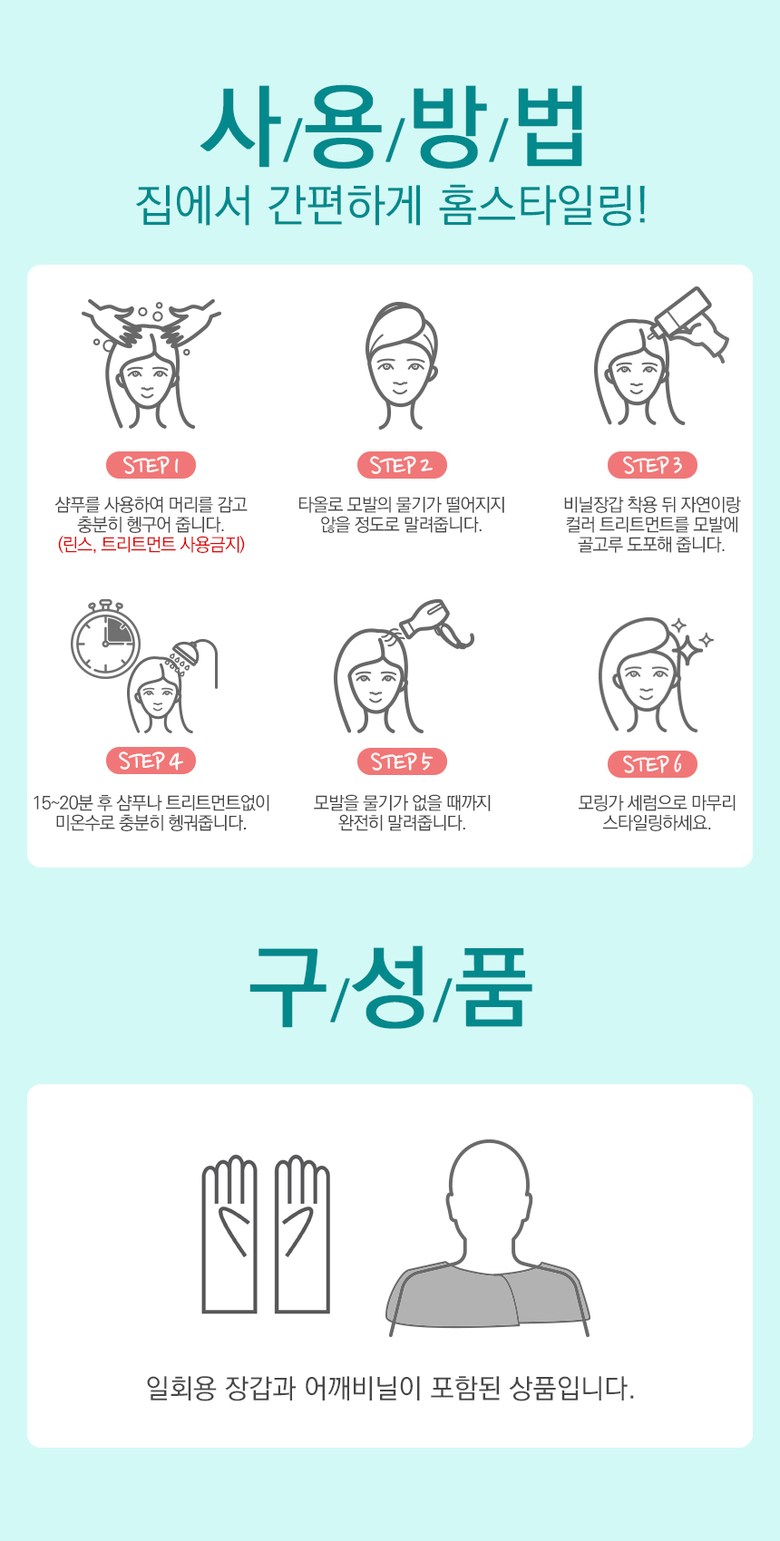 - How to use: 1. After shampooing, use a towel to remove excess moisture. (Do not use rinse, treatment, oil, etc.) 2. After wearing plastic gloves, apply the natural color treatment evenly to the hair. 3. After 15 to 20 minutes, rinse thoroughly with lukewarm water. The longer it is left alone, the more vivid the color becomes. (maximum 25 minutes)4. Dry the hair completely until there is no moisture. (After the treatment, if the hair is not completely dried and the moisture falls off, it may stain the clothes, so be sure to dry the hair.)