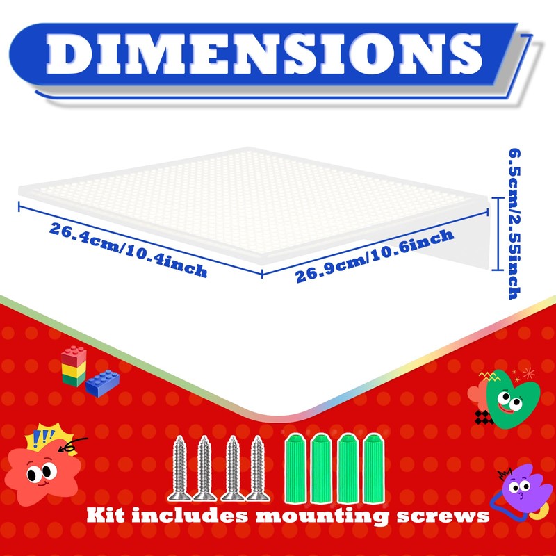 - Easy to Install: easy and quick to install, the stud base plate is removable, once the display is installed, just fasten the Building Bricks to the base plate and place them on the slots of each shelf.
