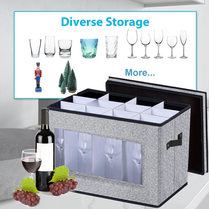 - 【Multifunctional】This collapsible storage box is not only suitable for wine glasses, but also suitable for mugs, champagne flutes, tea cups, and all kinds of suitable size cups. It can also be used as a moving storage box, remove the partition, and can prevent Christmas products, books and other clothes.