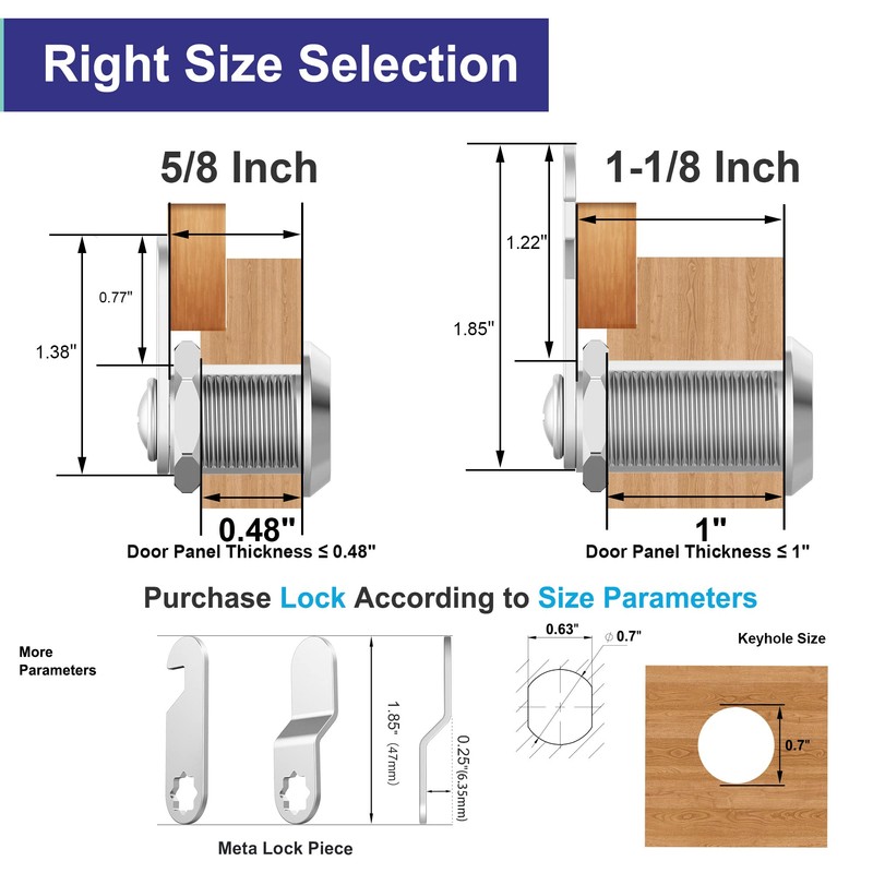 - 🔒 Common Size: The Cabinet Lock is a standard size cam lock with a 3/4"diameter and 1-1/8" length that is compatible with panels ≤ 0.94" thick. The mailbox lock replacement lock is perfect for file cabinets, drawers,desk, mailboxes, toolbox, camper or RV storage door. *Please check our dimensional chart (Figure 2) to ensure compatibility with your needs.