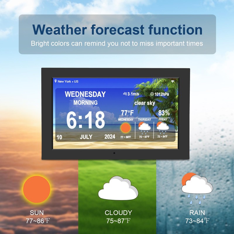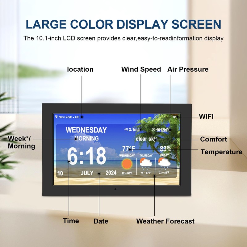 - [EASY TO USE] Plug in and connect to WiFi and select your city and you will see the local time, temperature, humidity and weather conditions. The digital wall calendars are wall mounted and desktop options make it the perfect daily planner for work planners to add to your office.