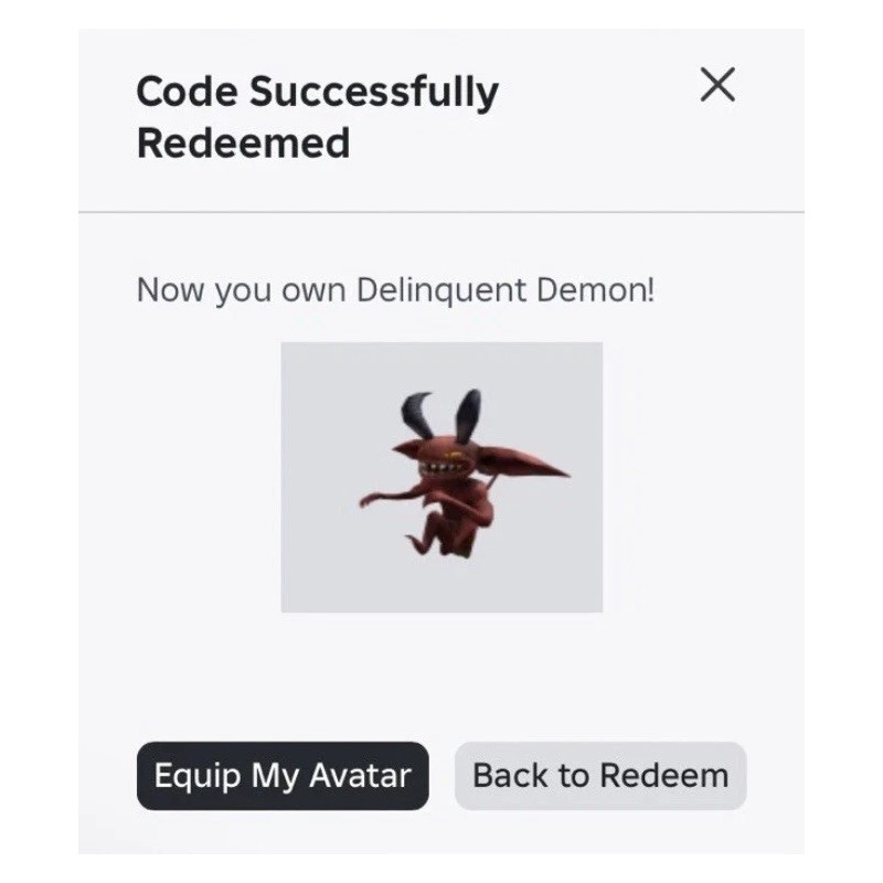This will redeem a "Delinquent Demon" shoulder accessory (with effects) upon your next login to your Roblox account.