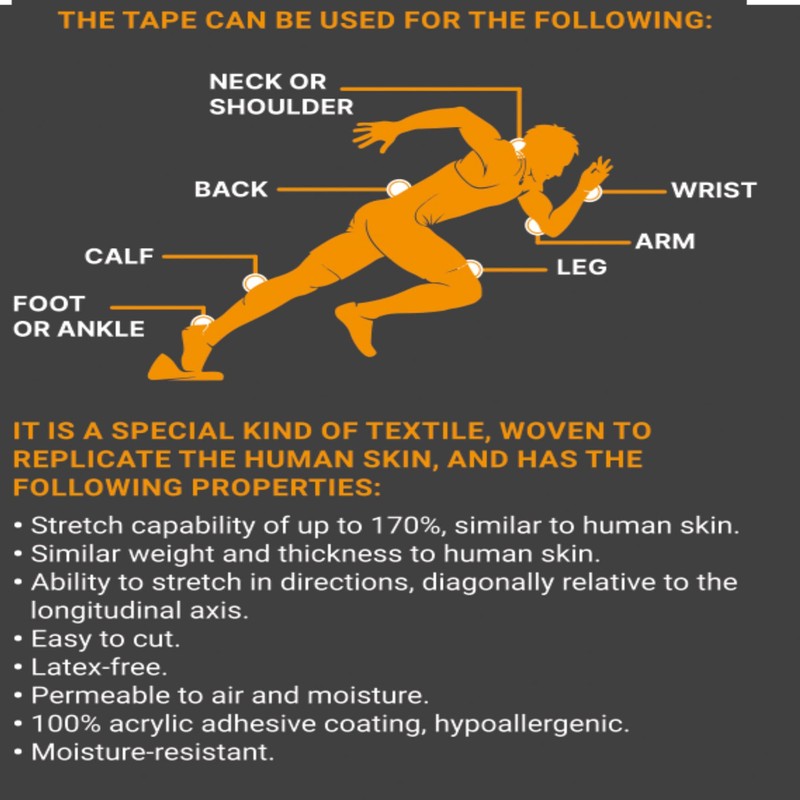 KINESIOLOGY TAPE has ensured millions of serious athletes can get back to the sport they love. Its unique elastic and stretchable properties allow sports enthusiasts to apply the tape exactly where they need it most, whether it be to protect or prevent an injury. It gently lifts the skin allowing blood to flow, lymph fluid to drain all while providing strong support.