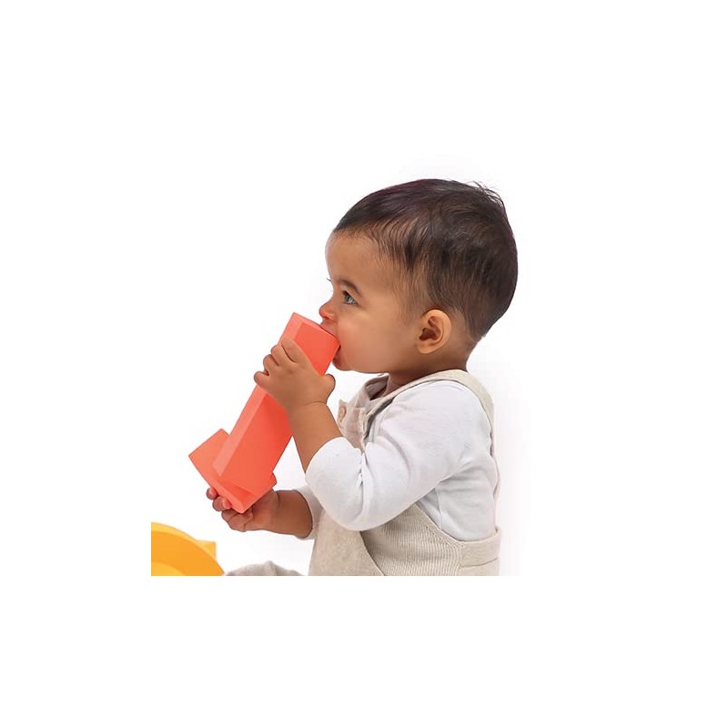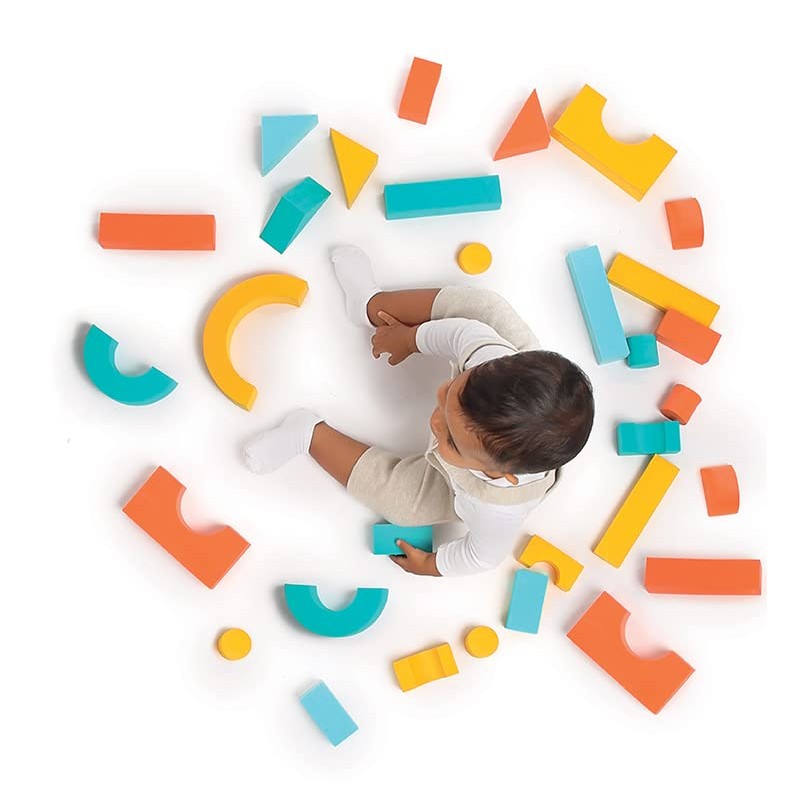- 28 colourful foam elements that allow children to build their first buildings, perfect for discovering gentle stacking and interlocking