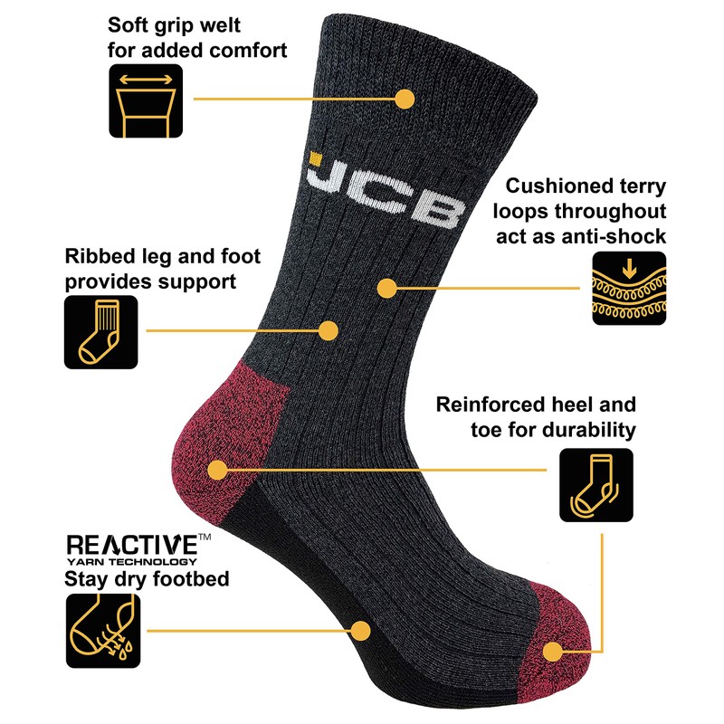 - NEW IMPROVED SUPPORT: JCB are the number 1 work boot sock in the UK. These JCB socks for men 6-11 are perfect work socks and casual wear socks. These JCB Men's black work boot socks with coloured heel and toes, come with a new and improved enhanced elasticated fit for comfort. The 3 pack ankle boot socks feature durable longer lasting heels and toes with Achilles support. These black ankle boot work socks feature an arch support, and reactive yarn moisture wicking technology for breathability