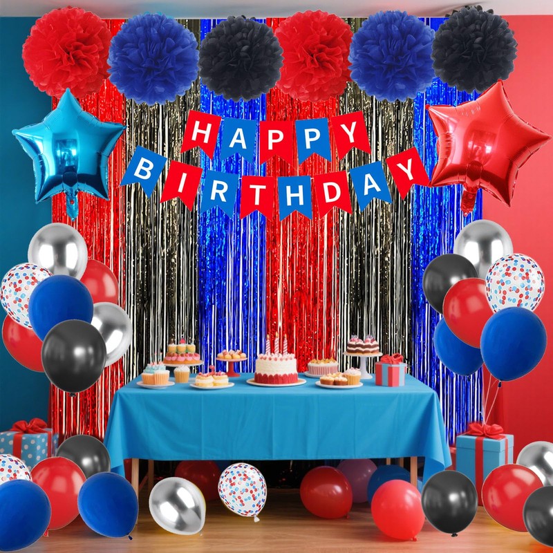 - Red White Blue Birthday Decorations: Hang the bold red-blue-black rain curtain, place the dynamic star foil balloons, and fill the area with vibrant balloons and festive tissue pom poms. Add the matching "Happy Birthday"banner for a celebration that pops!
