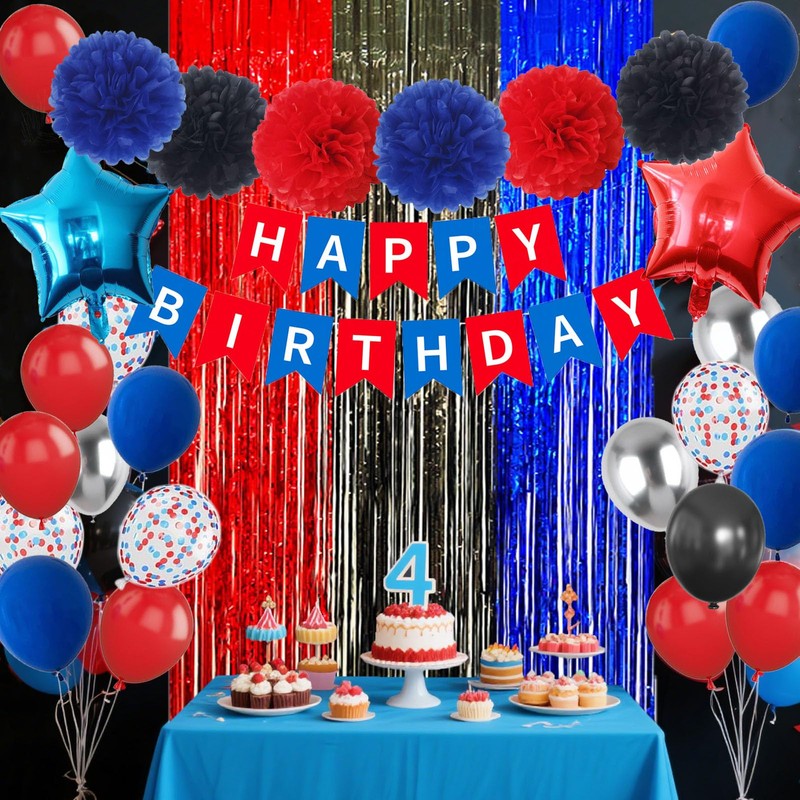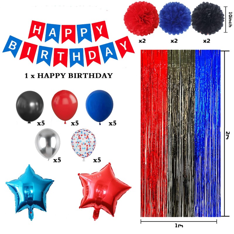 - Black Red Blue Birthday Decorations: The happy birthday party supplies include 2pcs foil balloons, 25pcs 12in latex balloons, 1 set red blue HAPPY BIRTHDAY banner, 6pcs 10in pompoms, 3colors fringe curtain, 1 roll of ribbon, 3pcs glue dots.