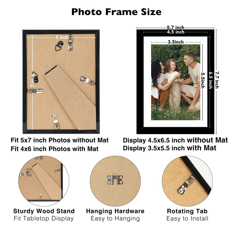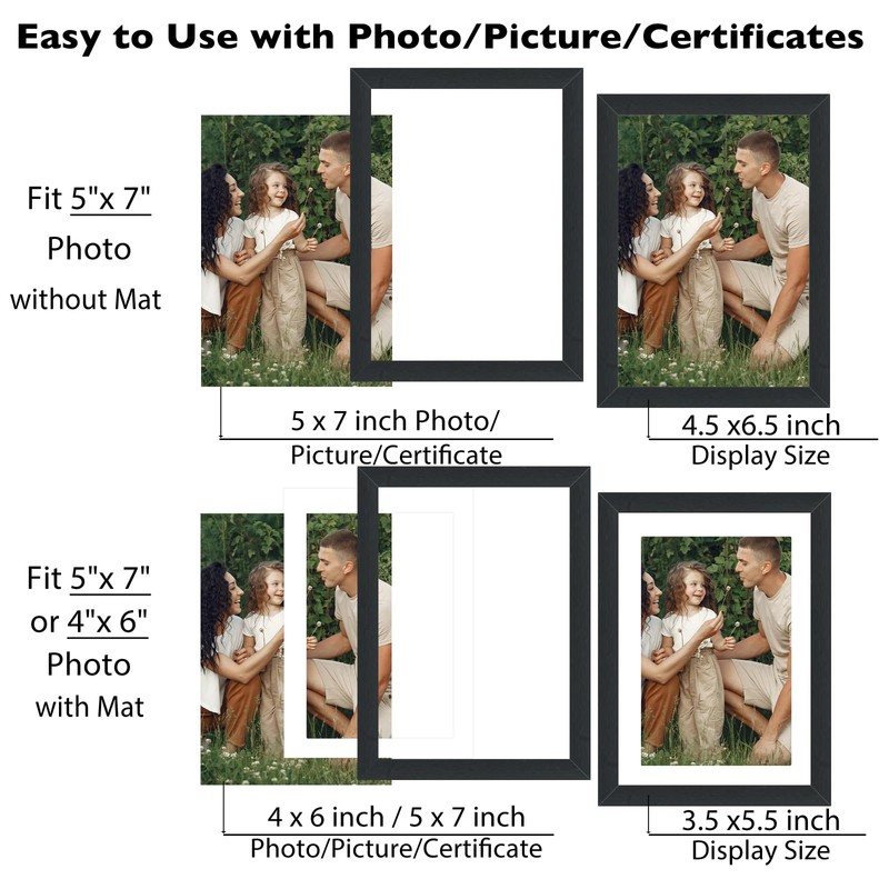 - FRAME SIZE: The black wall picture frame fits 4x6 inch and 5x7 inch photos pictures, simple and stylish. Please Note: 5x7 picture frame opening display will be 0.5 inches smaller than the photo to better hold the photo to prevent slipping.