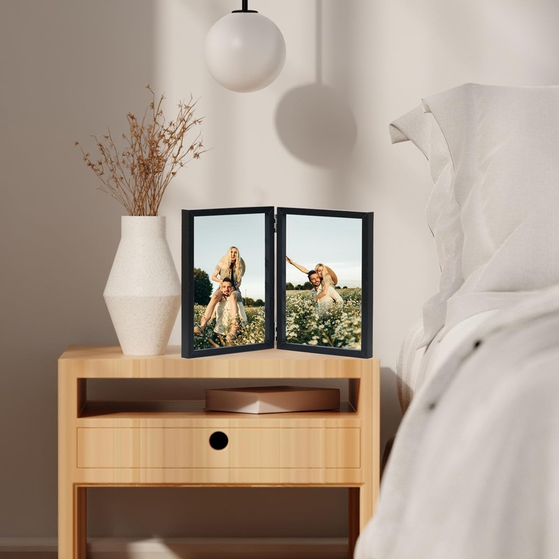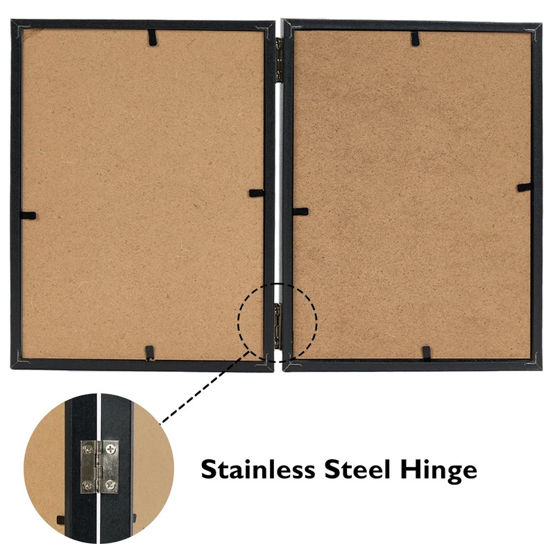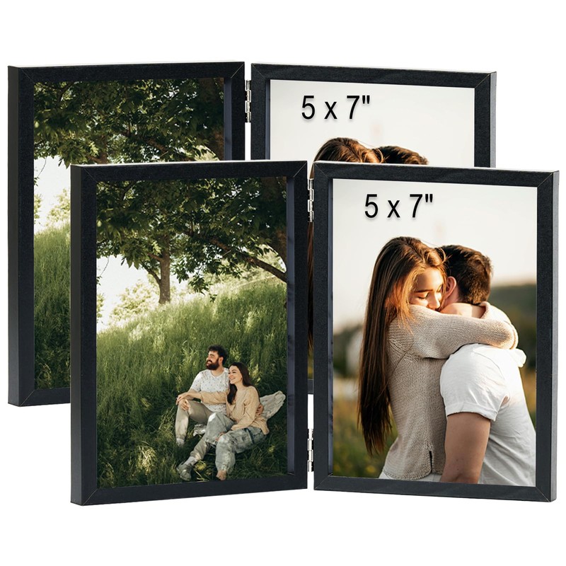 • EASY TO INSTALL: The back has outward-curved tabs so you can more easily remove the back panel and put in photos. The 2 5x7 photo frames are secured by metal hinges between them and can be folded or unfolded to 180 degrees. 5x7 side by side picture frame has a thickness of 0.6 inches and can be placed vertically on top of table, shelf, and desk headboard.
