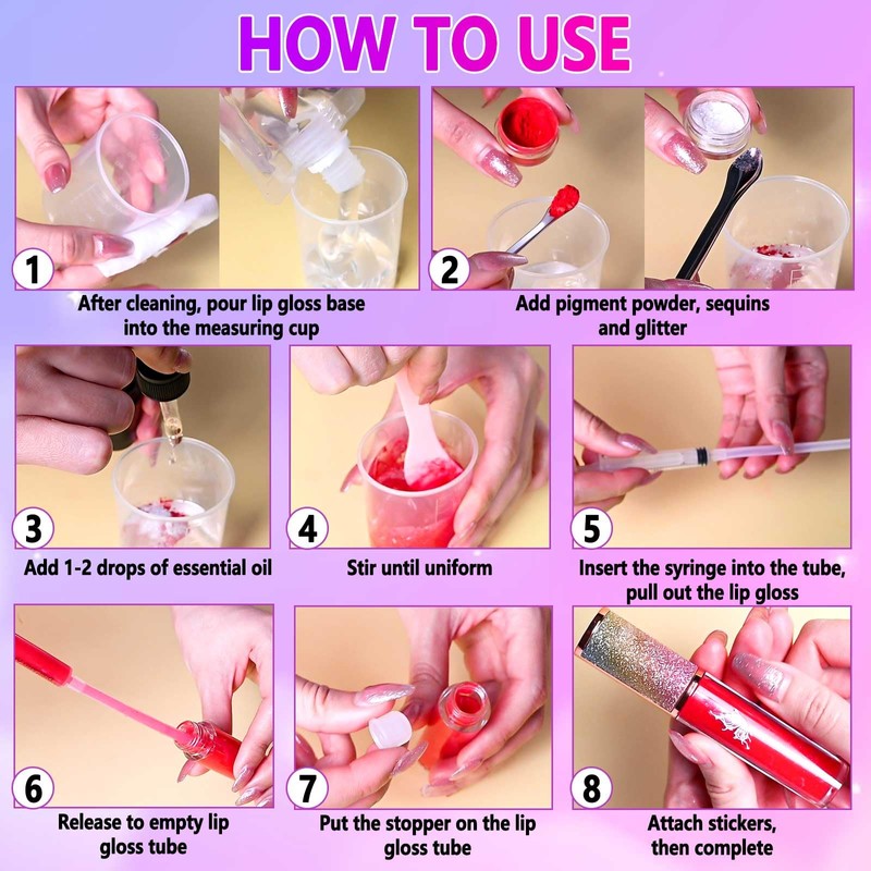 • PCS PERFECT LIPGLOSS SETS FOR GIRLS: JCOOS lip gloss making supplies includes Lip Gloss Tubes, Lip Gloss Pigment, Glitters, Sequins, Jojoba Oil, Butterfly Stickers, Lip Gloss Base (g ), Measuring Cups, Spoons, Stirring Sticks, Mesh Bags, Bow ties, Syringes, Soft Tubes, Cleaning Brushes, Disposable Gloves.