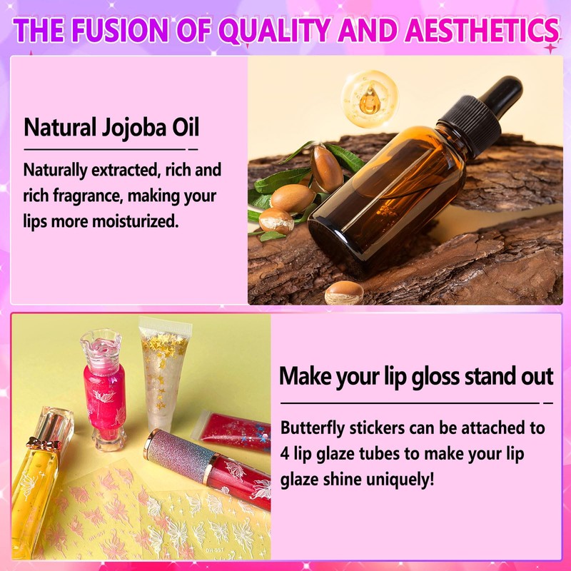 • EXQUISITE BEAUTY, EXCEPTIONAL QUALITY: We offer four distinct types of exquisite, high-quality lip gloss tubes designed to make you stand out from the crowd. Comes with two colors of butterfly stickers for decoration. Instructions are offer for beginners, making the process of creating kids lip gloss more simple, safe and meaningful at home.