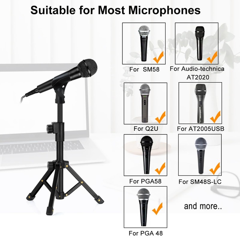 - Metal material: Made of strong metal, highly-durable ABS plastic and the feet desinged with non-slip rubber pads, even the tripod mic stand with mini and lightweight body but with strong holding power to ensure your microphones don't fall down and stays in place firmly