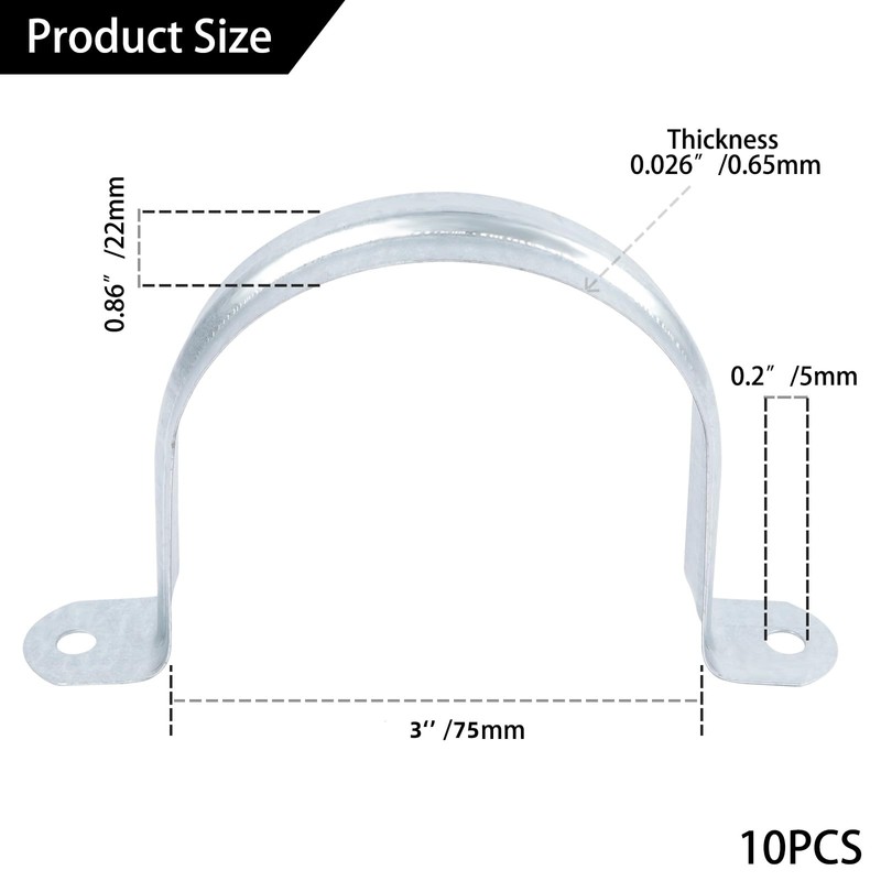 - [Product Specifications] The inner diameter of pipe strap is 3 inches, suitable for pipes with an outer diameter of 20 mm. The width of the clamp is 13 mm, the thickness is 0.5 mm, and the diameter of the holes on both sides is 5 mm. Please carefully measure the outer diameter of the pipe before purchasing pipe strap clamps to avoid buying the wrong size.