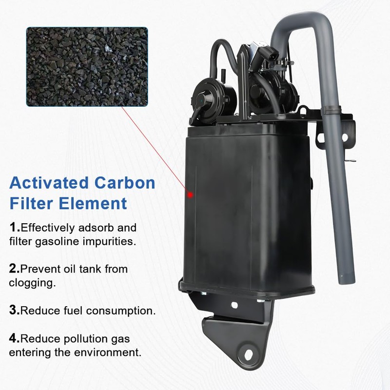 • Strong Adsorption: The evaporative emissions charcoal canister contains activated carbon particles with strong adsorption. They can efficiently absorb excessive gasoline molecules and filter out impurities, making gasoline recycled. This helps to reduce fuel consumption and prevent blockages in the fuel tank. Furthermore, it is also able to purify the gas that will be released into the atmosphere