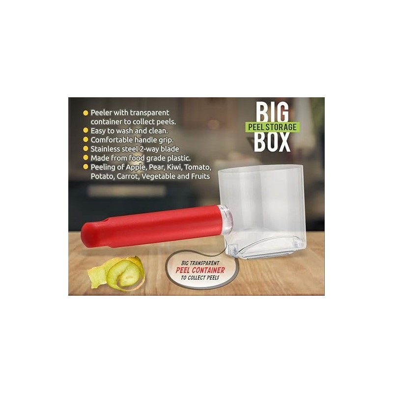 - AJE Fruit Peeler with Container Multi-Function 2-Way Vegetable Peeler with Storage Box Twin Stainless Steel Blade Soft Grip Apple Peeler for Kitchen Veggie Potato Cucumber Carrot Apple (Pack of 1)