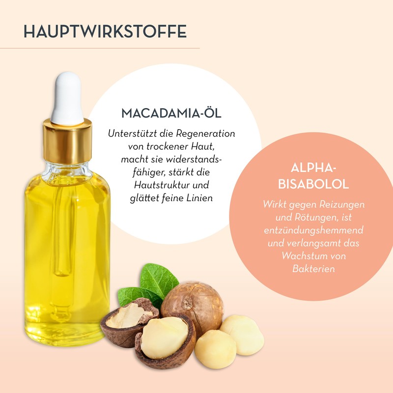 - For all skin types: the cleansing oil contains coordinated combinations of highly efficient active ingredients from the facial care, which ensure quickly visible and sustainable results. Macadamia oil and alpha bisabolol are provided for every skin type. The former supports the face in the regeneration of dry skin and ensures smoothed facial skin. Alpha-Bisabolol, on the other hand, has an anti-inflammatory effect and acts against redness.