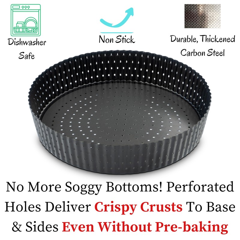 • ✔ NO MORE SOGGY BOTTOMS ON TARTS, QUICHES & PIES - This custom designed pie pan / tart pan / quiche pan / flan pan by Jean Lemond has ingenious perforated holes that allow hot air to circulate not just on the top of your pastry but the base and the sides also giving you the crispest, the most delicious, the most melt in your mouth crusts of all!