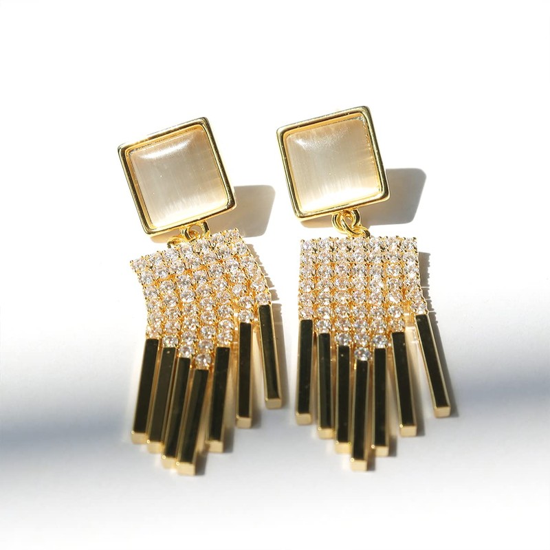 - Simple delicate small square peach pink cat eye crystal push back,with dangly cubic zirconia chain gold bar tassel fringe, charming arrow tip, sparkly white rhinestones, nice for every lady, also teacher.