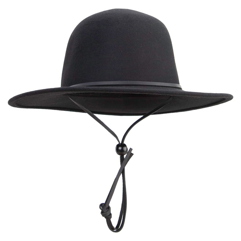 Stylish and classic wool felt hat for men. Round top crown. A brown chin strap is featured. Brim is flexible and flat. Our man's wool felt hat is great for any adventure, horse riding, camping, hunting and other outdoor event. Fall and Winter. 13(W) X 14(L) X 4.5(H) inches. Soft, durable and warm material. Available in different colors and styles.
