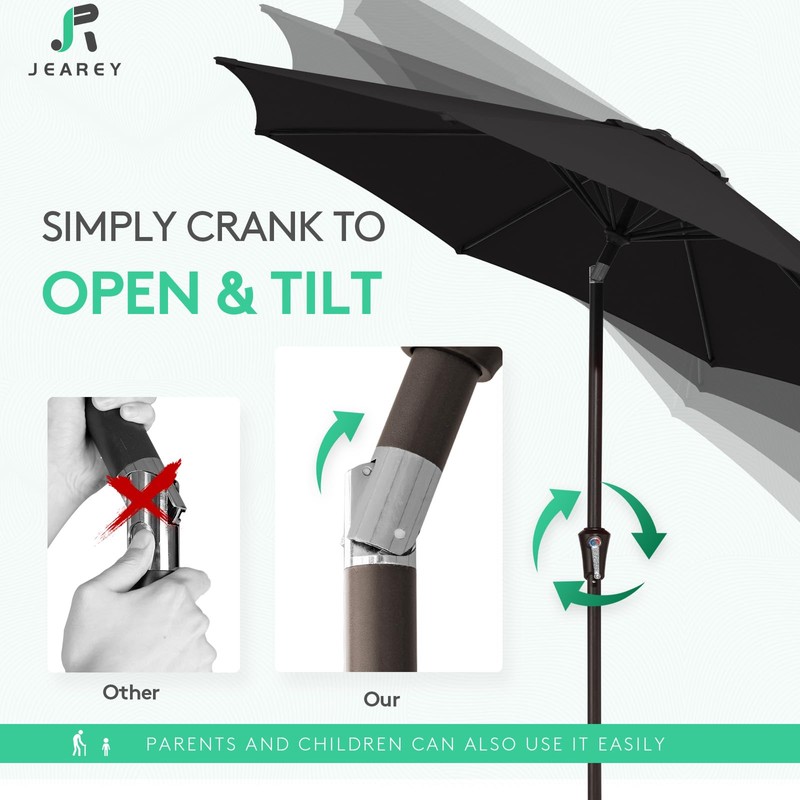 - AUTO TILT CRANK SYSTEM: The crank lift mechanism makes it easy to open and close the umbrella in seconds. Simplify the regular tilt buttons, allowing parents and children to easily get the desired angle as the sun runs. It achieves precise control over the fixed tilt angle of traditional outdoor umbrellas