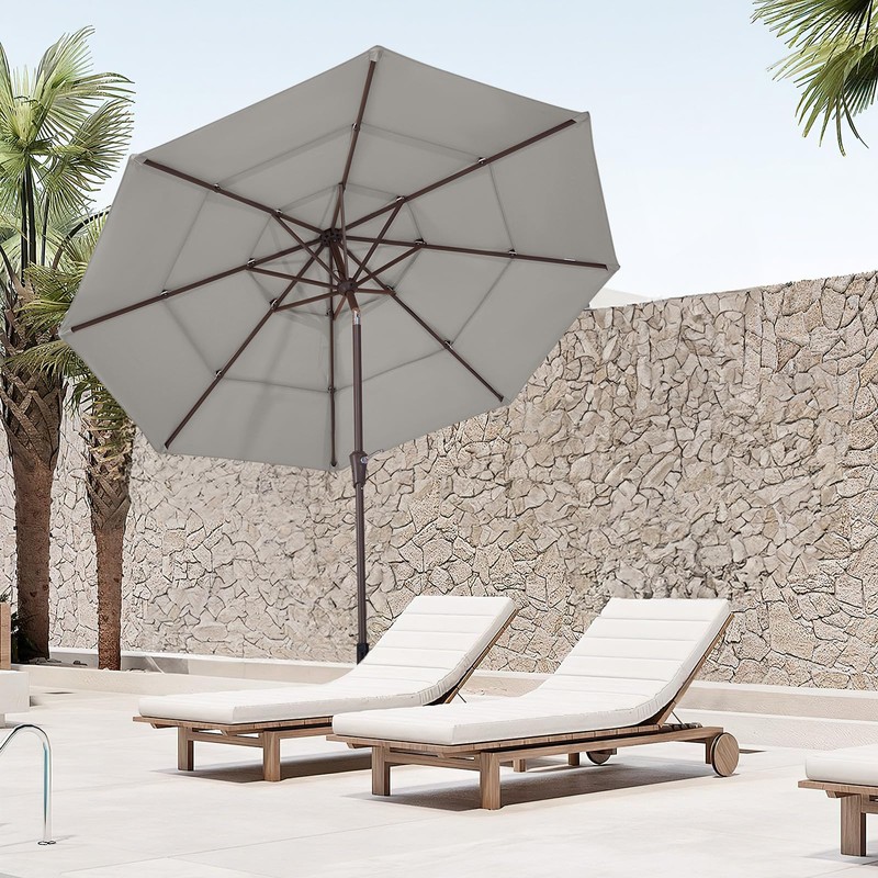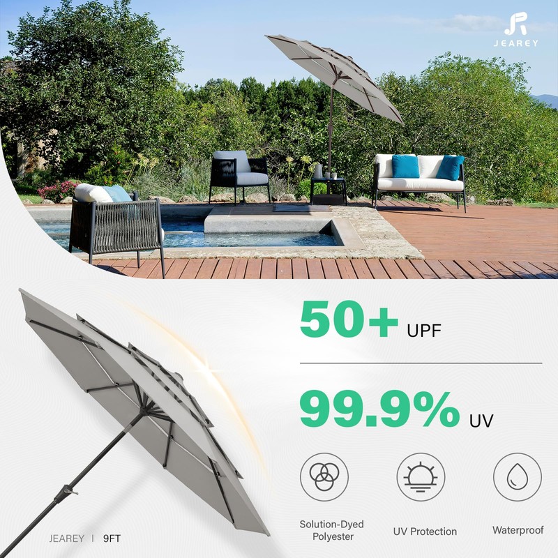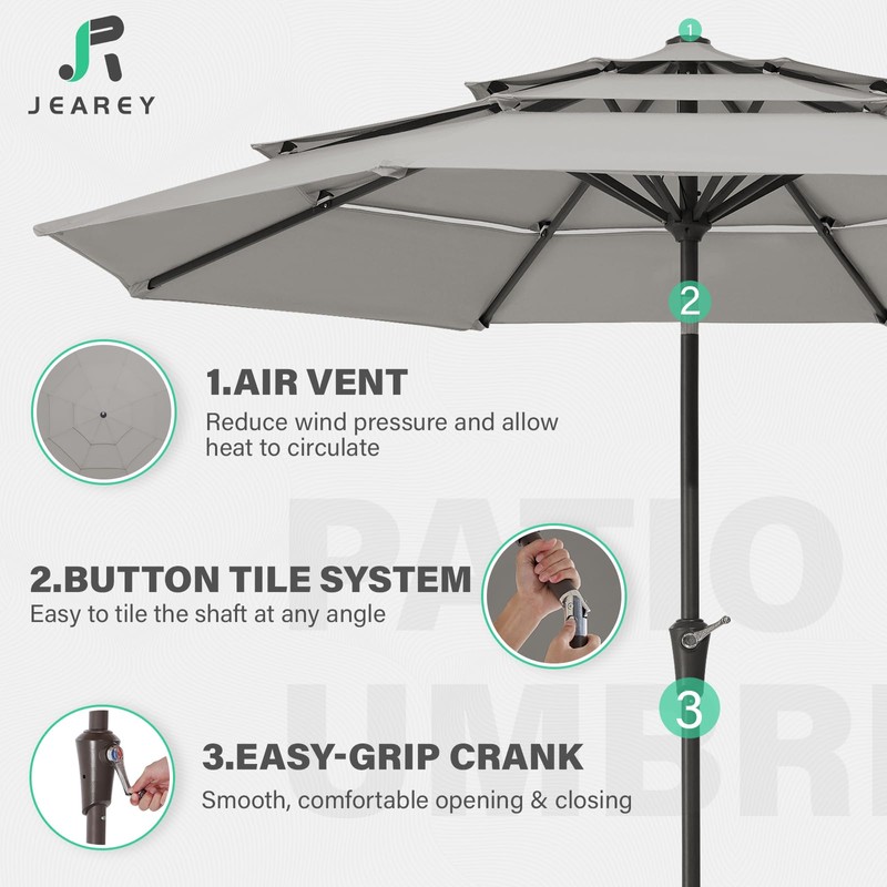 JEAREY 9FT 3 Tier Patio Umbrella Outdoor Market Umbrella Table Umbrellas with 8 Ribs 1.5 Pole Push Button Tilt and Crank UV Protection for Garden,Backyard,Pool,Light Gray