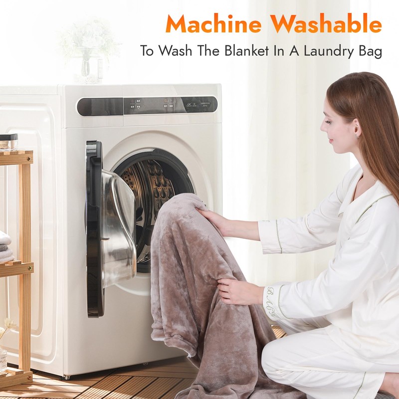 - Machine Washable - The heating blanket can be washed and bent. To wash in the washing machine, please insert the USB cable into the pocket and place the blanket in a laundry bag and dry in a cool place out of direct sunlight. It is recommended to wash it once before first use.