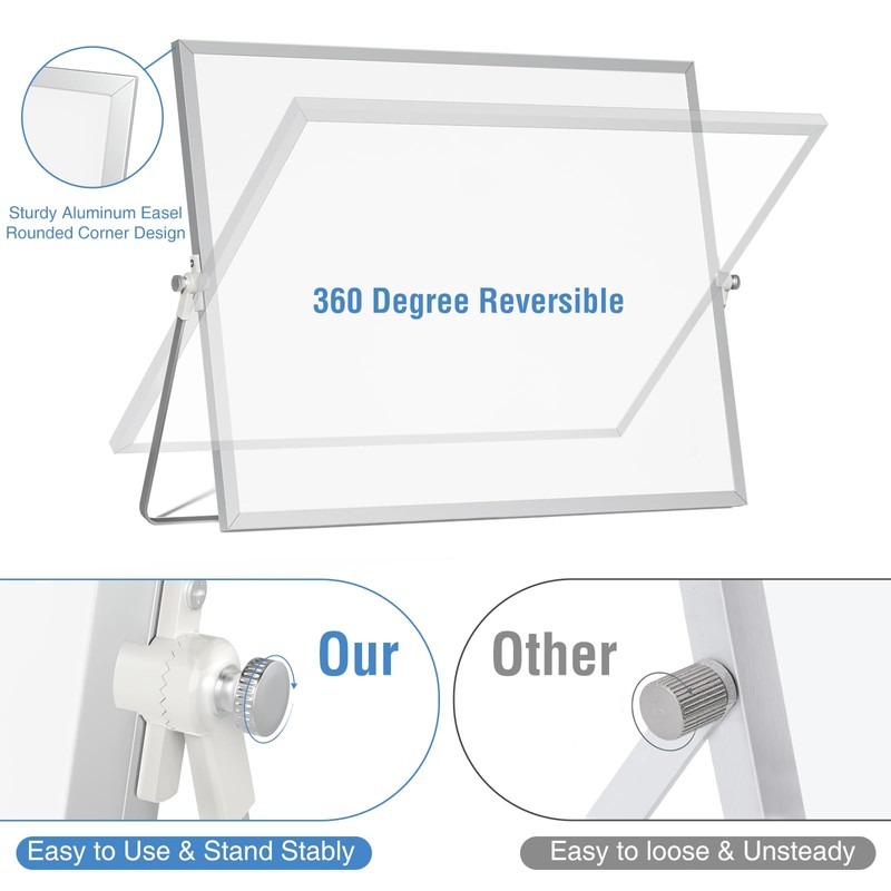 • 【360 Degree Reversible】Magnetic dry erase whiteboard easel adopts an aluminum alloy frame, the structure is strong, and the obtuse edge design ensures safe use. The hangable, tileable and standing whiteboard with UPGRADED 360° adjustable knob that makes it easier to lock the board and conveniently adjusts to a comfortable angle, allowing the board to stand up securely, whether for adults or children are easy to operate. Perfect for daily reminders, grocery lists, to-do lists, meal plans and grocery lists etc. without paper wasting.