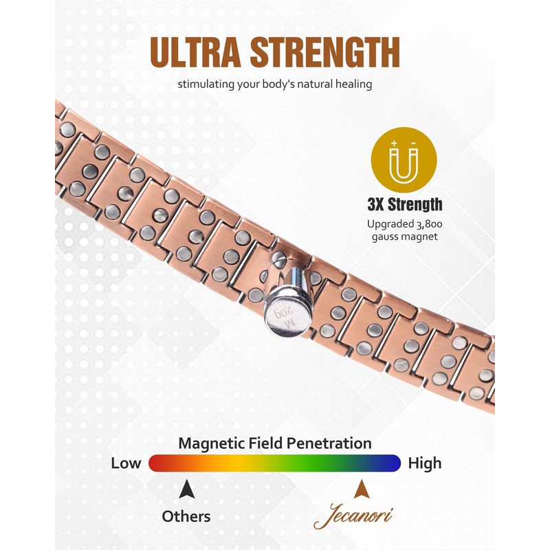 - [ADJUSTABLE AND COMFORTABLE FIT] This mens copper bracelets arrives at 9.05 inches (23cm) in length and includes a FREE sizing tool. Designed with an adjustable link strap, the magnetic bracelet can be easily resized to ensure a perfect fit for all wrist sizes.