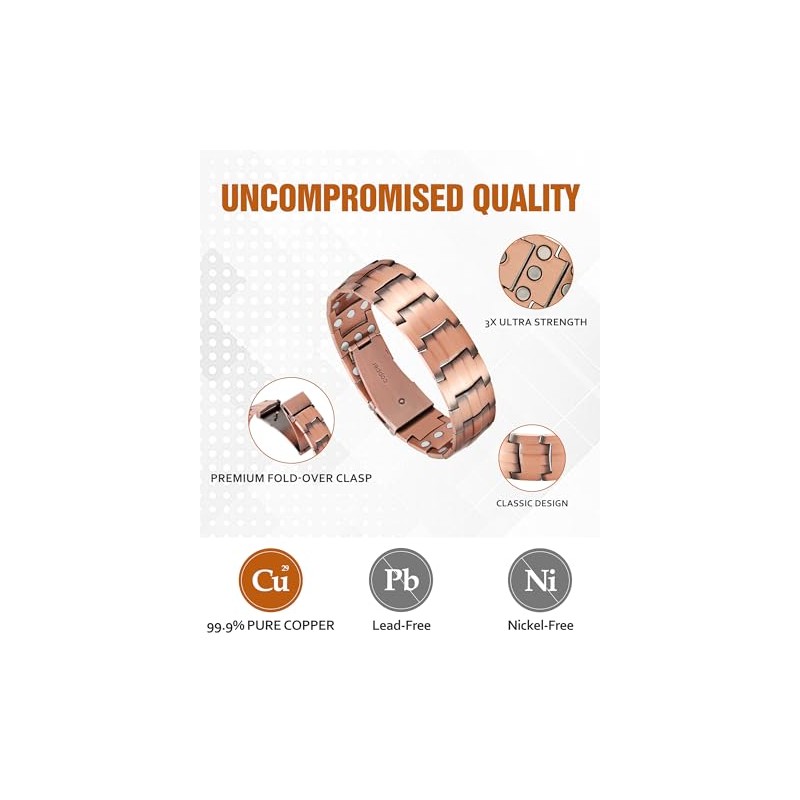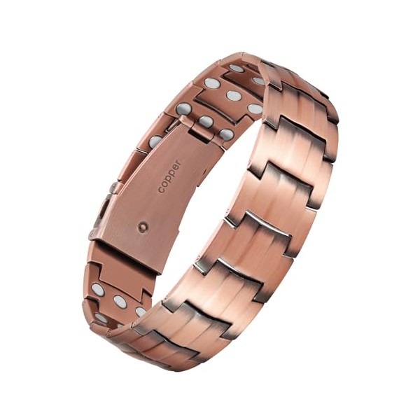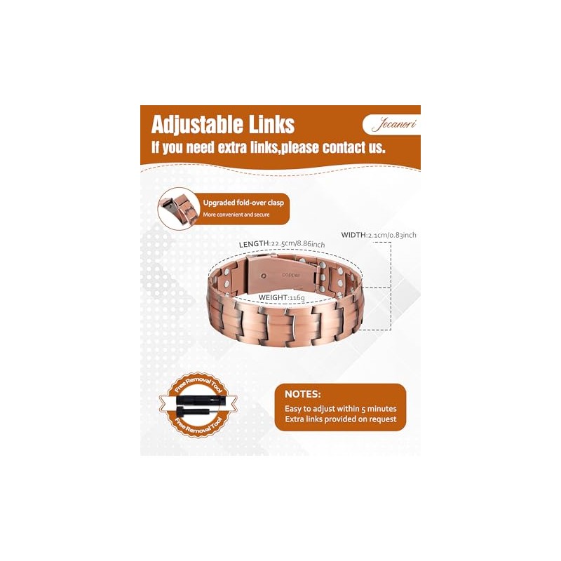 - [ADJUSTABLE AND COMFORTABLE FIT] This mens copper bracelets arrives at 8.86 inches (22.5cm) in length and includes a FREE sizing tool. Designed with an adjustable link strap, the magnetic bracelet can be easily resized to ensure a perfect fit for all wrist sizes