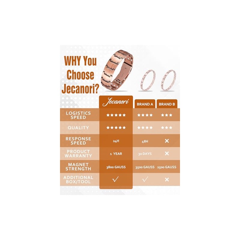 - [SLEEK DESIGN] Redefine your style with Jecanori magnetic bracelet that seamlessly blends therapeutic functionality with aesthetics, caters to the discerning taste of modern men. Copper bracelet for men are meticulously crafted using high-quality pure copper, known for its anti-inflammatory properties