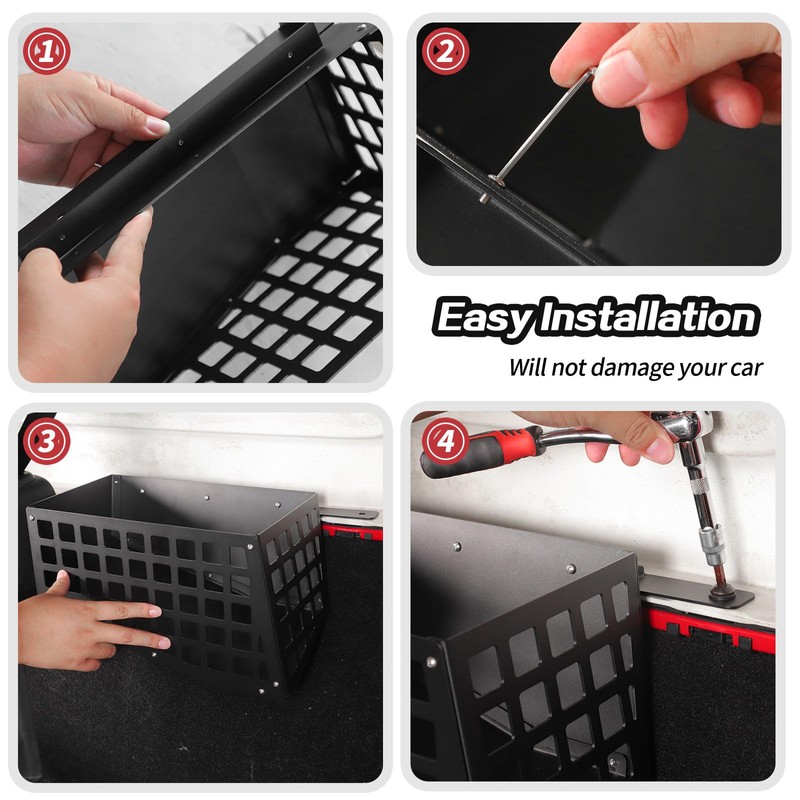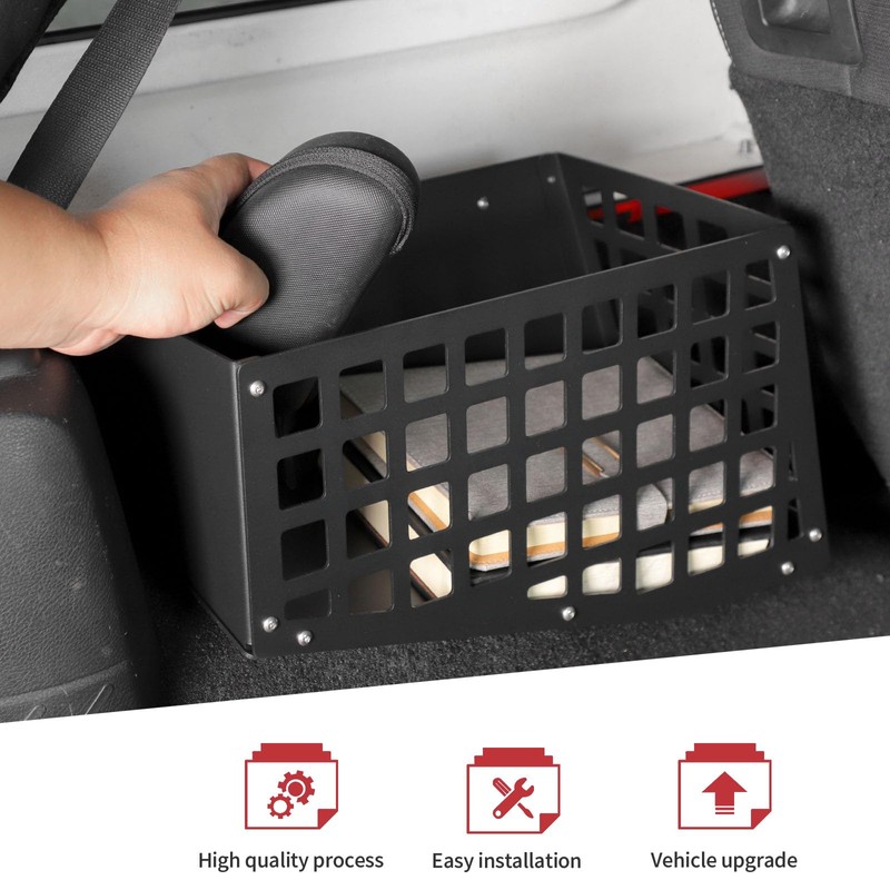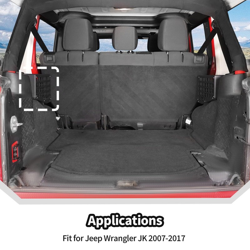 - ➤ADD EXTRA STORAGE -- JeCar Make full use of the free space on the side of the trunk to design this unique storage accessory. Create extra storage space for your common stuff on the rear trunk by using this new Wrangler storage accessory, convenient for placing rope, flashlights, tools, and others, etc.