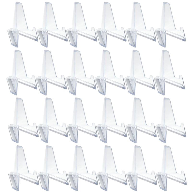 - HIGH QUALITY MATERIAL These 24 mini easel stands are crafted from premium acrylic that provides a crystal clear look for a pristine display of your precious collectibles. The smooth surface protects your items from scratches