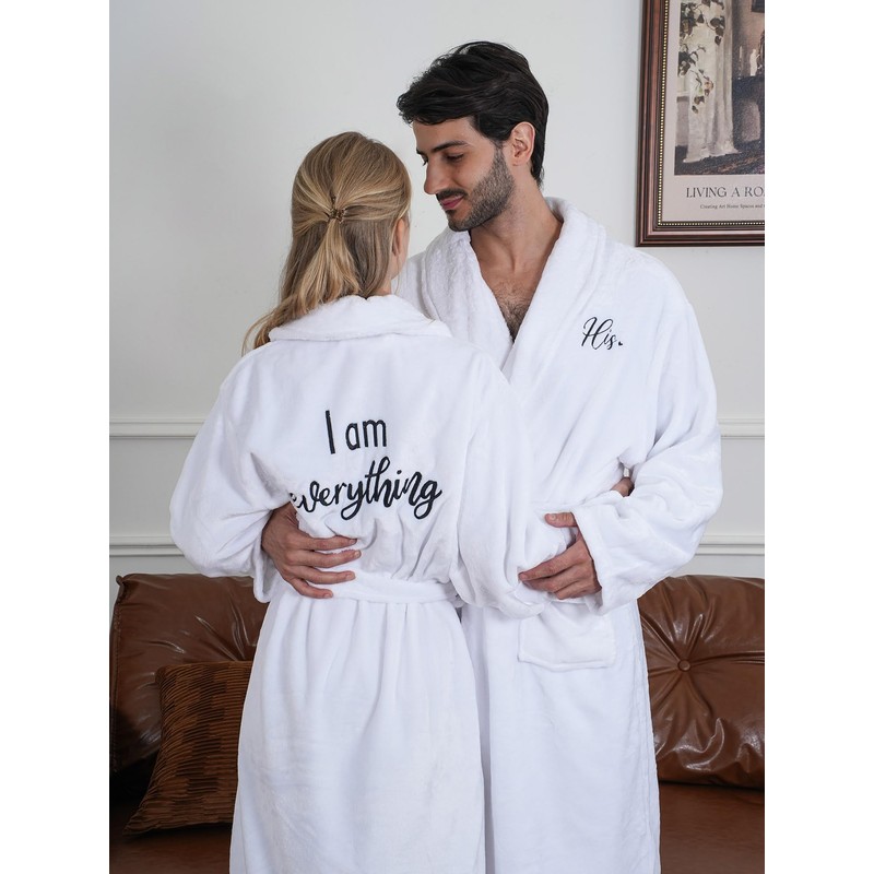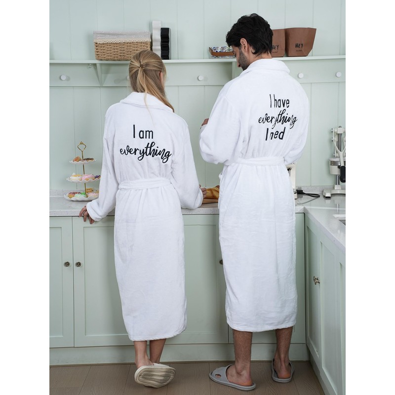 - Trendy Design: attractive design breaks with tradition, with the men's robe embroidered with the phrase [I have everything I need] on the back and "his" embroidered on the front; The women's robe stating [I am everything] on the back and "hers" embroidered on the front; The matching robes for couples is simple and elegant, and the kimono collar adds elegance to the overall bathrobe; Two pockets can be applied to carry mobile phones, keys and other personal items