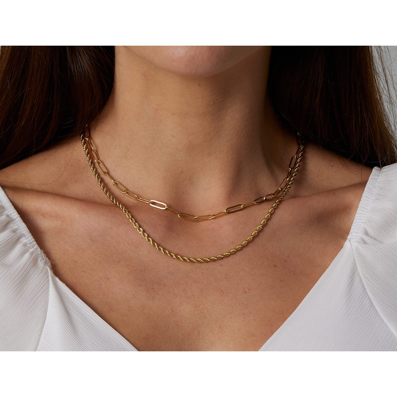 - SIZE OF GOLD NECKLACE: Rope necklace’s width is 2.7mm, Length is 16.5"+2"; paperclip chain necklace’s width is 4mm, length is 15"+2". Choker and Princess length of necklaces for women meets the daily wearing needs. A must-have accessory, adding personal charm and stylish look, and bringing metal power and vitality to your life