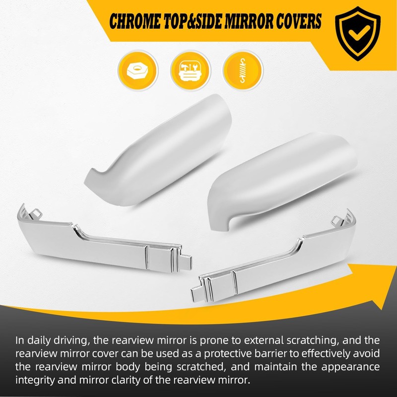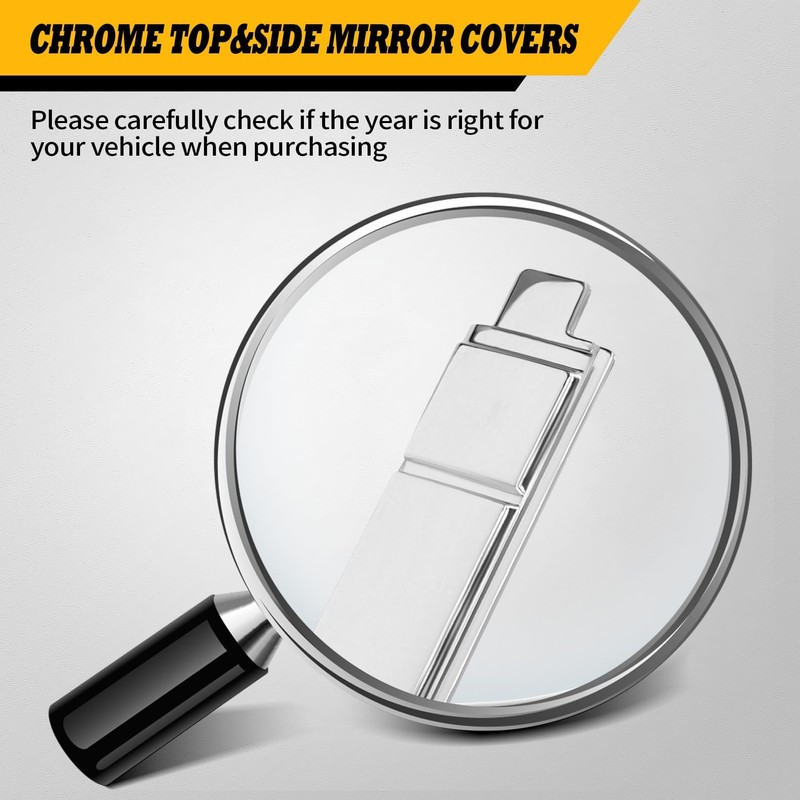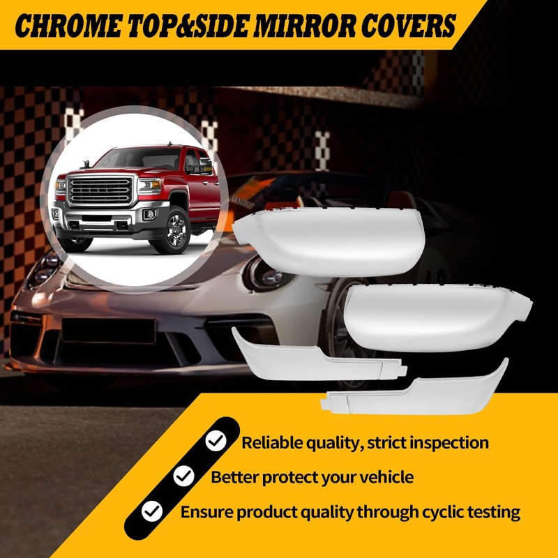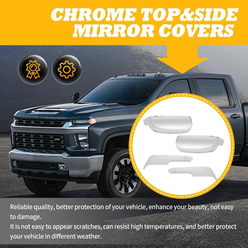 - Fitment: Rearview mirror cover compatible with Sierra 2500/3500 HD 2020-2023, compatible with Silverado HD 2500/3500 2020-2023, the mirror covers have a sleek chrome finish and they are the perfect accessory to enhance the aesthetics of your truck