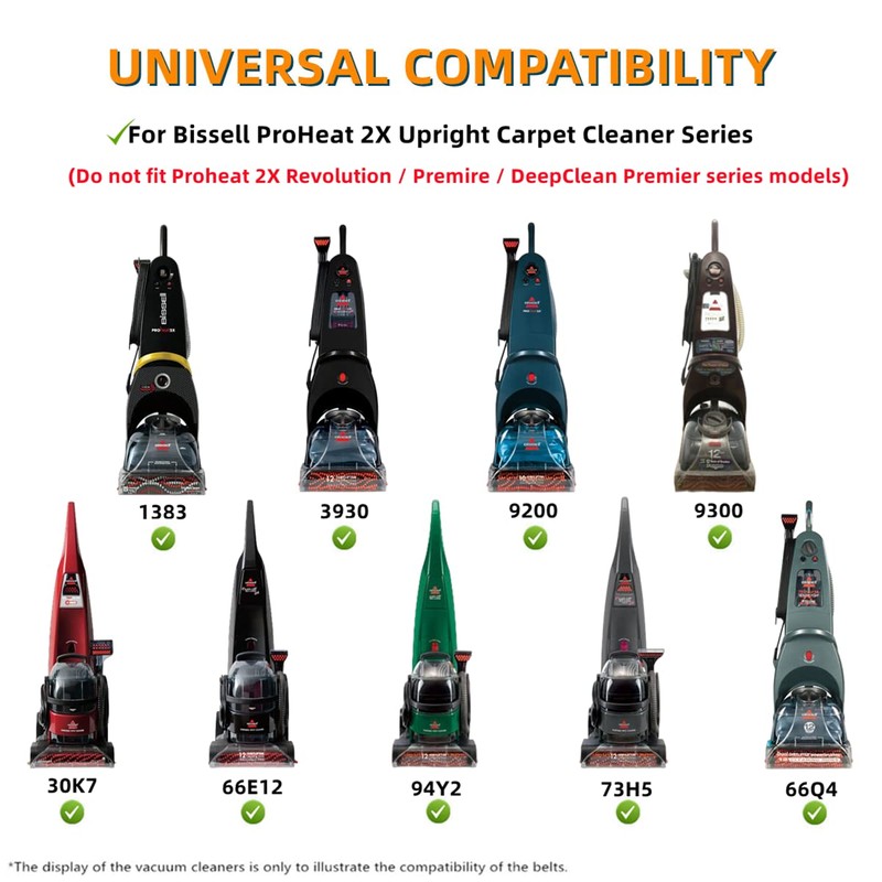 - Broad Compatibility - These Belt Set are perfectly Compatible with Bissell Proheat 2X Models 1383, 3930, 8930, 9200, 9300, 9400, 73H5, 30K7, 94Y2, 66E12, 66Q4 Series.(Don't fit Proheat 2X Revolution, Proheat 2X Premire and Proheat 2X DeepClean Premier series models.)