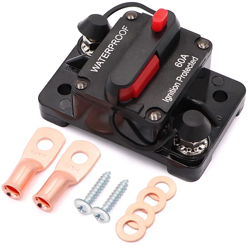 Jeemiter 60 Amp Circuit Breaker with Manual Reset Wire Lugs Copper Washer and Screws for Car Marine Trolling Motors Boat ATV Manual Power Protect for Audio System Fuse, 12V-48VDC