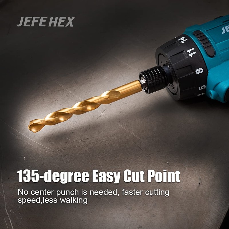 JEFE HEX 1/4" HSS Twist Titanium Drill Bits, Hex Shank for Quick Change, 135 Degree Easy Cut Split Point Drill Bit for Steel, Copper, Aluminum, Zinc Alloy, Wood, and Plastics (Pack of 6).