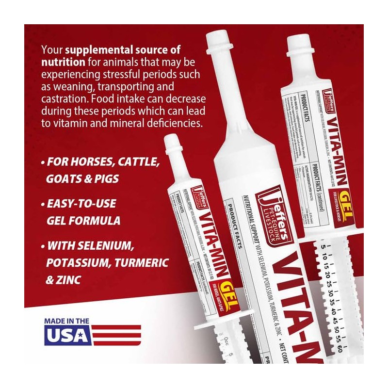 Jeffers Vita-Min Gel is a high-quality multivitamin and mineral supplement formulated to support livestock and horses during stressful periods, including weaning, transportation, illness recovery, and environmental changes. When food intake decreases, animals may experience vitamin and mineral deficiencies, impacting their overall health. This premium gel is enriched with essential nutrients like Selenium, Zinc, Potassium, and Turmeric to promote immune function, muscle strength, digestion, and overall vitality. Designed for cattle, goats, sheep, pigs, and horses, it helps maintain electrolyte balance and nutritional support. The easy to administer oral gel ensures quick absorption, making it an ideal supplement for farm and ranch use. With a convenient 60 CC (2 OZ) size, it's perfect for on the go care, ensuring optimal health and performance for your animals.